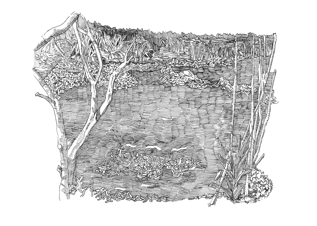 For the body of work this piece is from, Katie Dorame drew landscapes from films that indirectly feature bodies of water. This drawing is from Alfred Hitchock's Psycho (1960), from the final scene when they retrieve the victim's car from a nearby swamp. It was shot in Los Angeles.