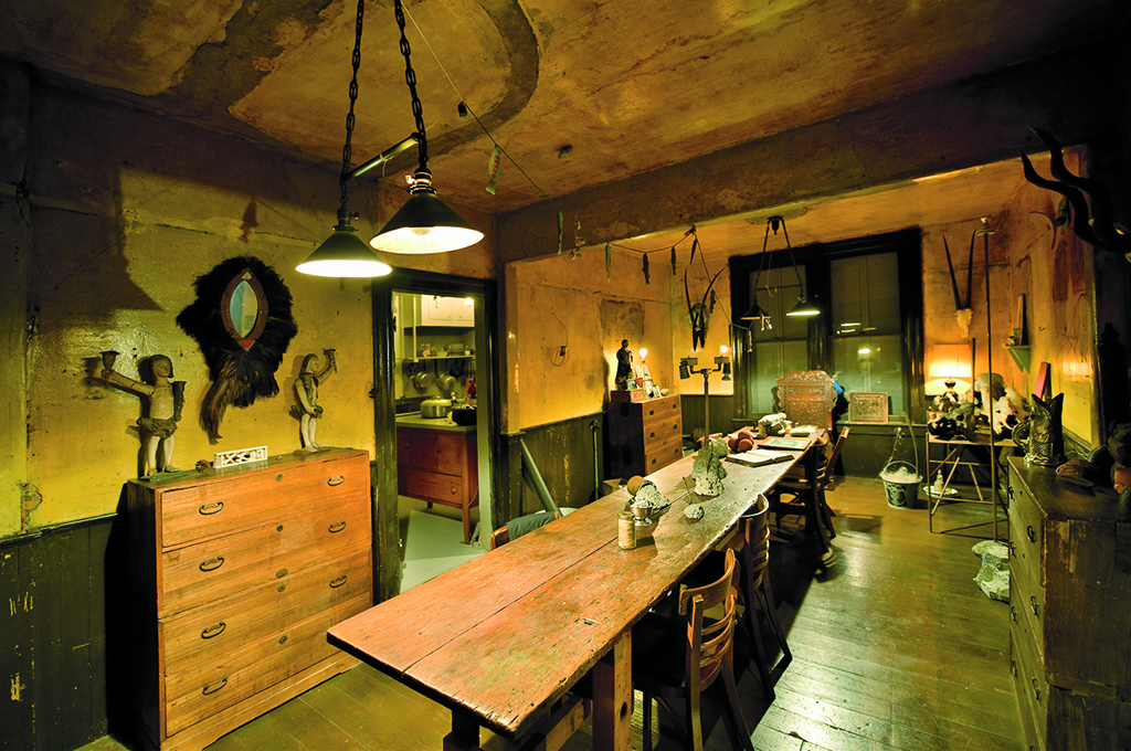 Many photos from the four decades Ireland lived at the house create an impression of the structure’s ever-changing nature, as well as a persistent feeling of arrested decay. Ireland regularly added to and changed the work installed in the house, but photos from as recently as 2007 show the building with its faded paint, cracked walls, and blemished wood flooring thoughtfully preserved as if it had always been a museum. It is ghostly and somewhat melancholic. During his initial renovation, Ireland removed carpeting and layers of wallpaper, restoring the house to one of its earlier states. He even stripped the paint that was under the wallpaper, revealing cracks in the plaster, which he preserved with copious coats of varnish.