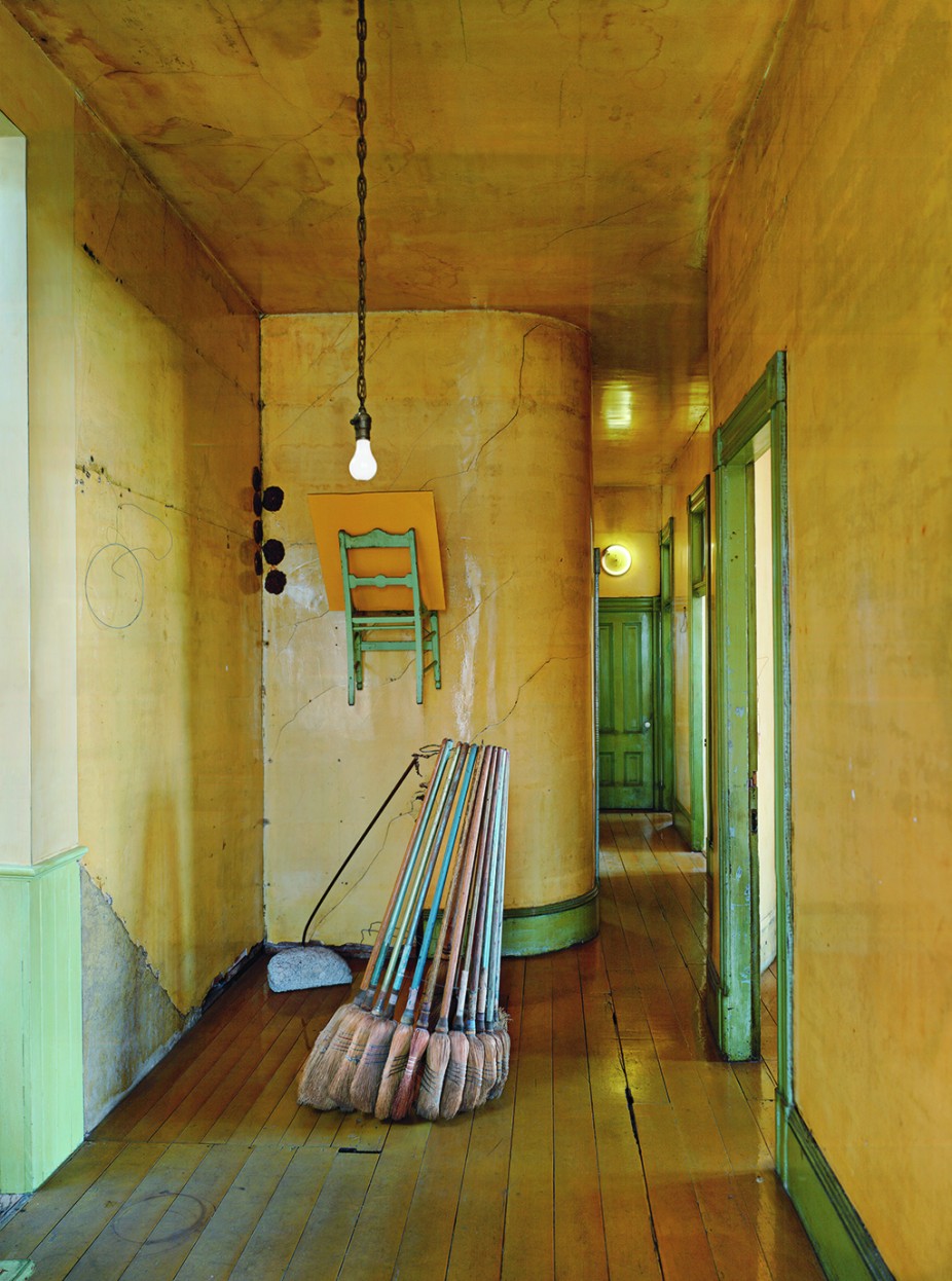 As Lewallen details, the site’s past provided considerable inspiration and material for Ireland’s work. Greub was a bit of a hoarder, and his move out of 500 Capp Street seems to have been incomplete; Ireland often likened himself to an anthropologist as he continually discovered new features and objects left over from the accordion maker’s 38-year occupation. The iconic sculpture Broom Collection with Boom (1978–88) is made from 18 used brooms that he found throughout the house. The aged brooms, arranged in a circle that seems to replicate and crystallize the passage of time, look harmonious against the house’s antique yellow walls. This eerie entity seems far more at home at 500 Capp Street than in the pristine confines of a white-cube gallery.
