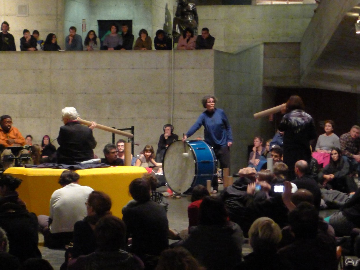 PM: I am so freaking ridiculously sentimental now every time I step into this space and think about the fact that this incarnation of the Berkeley Art Museum is about to end. The museum is vacating these premises because it was decided over a decade ago that all this cantilevered concrete apparently does not do well in an earthquake. As we’re getting closer and closer to that date of closure, the institution has loosened itself up and given itself over—at least the atrium—to people, to performers to act in it in ways that haven’t been imagined before. And so I really wanted to ask you about your impressions, your feelings, as you are about to perform in this space for the last time.