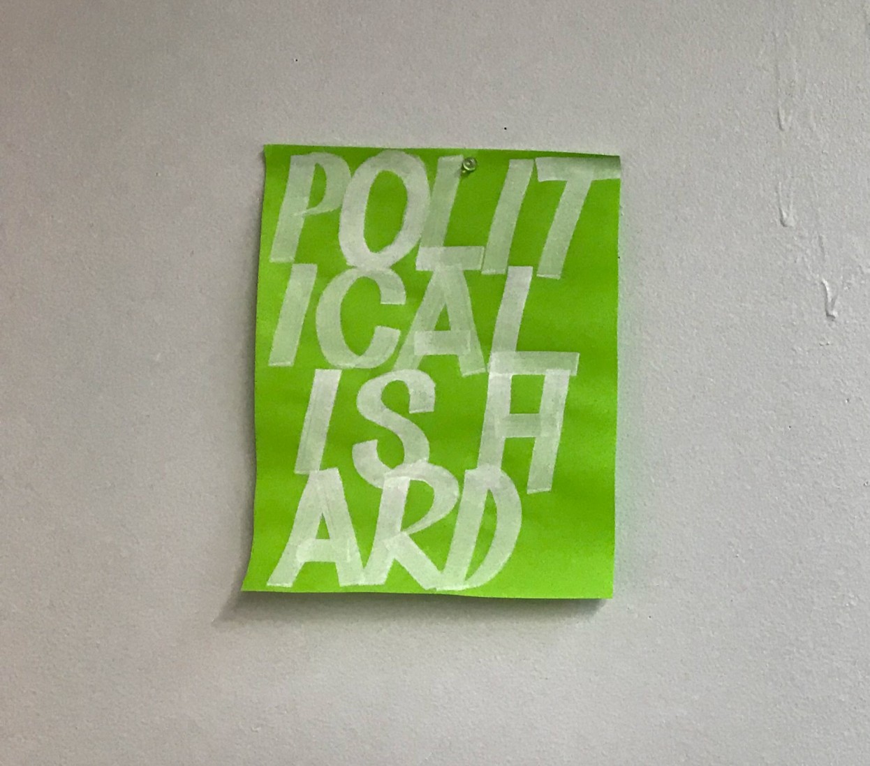 I wonder if it’s a fuzzy perception of what exactly is “the political” in the work that makes students wary of attempting and/or appreciating it. Maybe they see it as too topical or requiring a measure of gravity they aren’t yet capable of. Or, that it has to be directly about a specific issue or a cause, and they are not allowed to be neutral about their position. Perhaps they feel they must court controversy and shock for the work to be effective. But, who are we kidding? It’s terribly hard to out-shock this present administration.