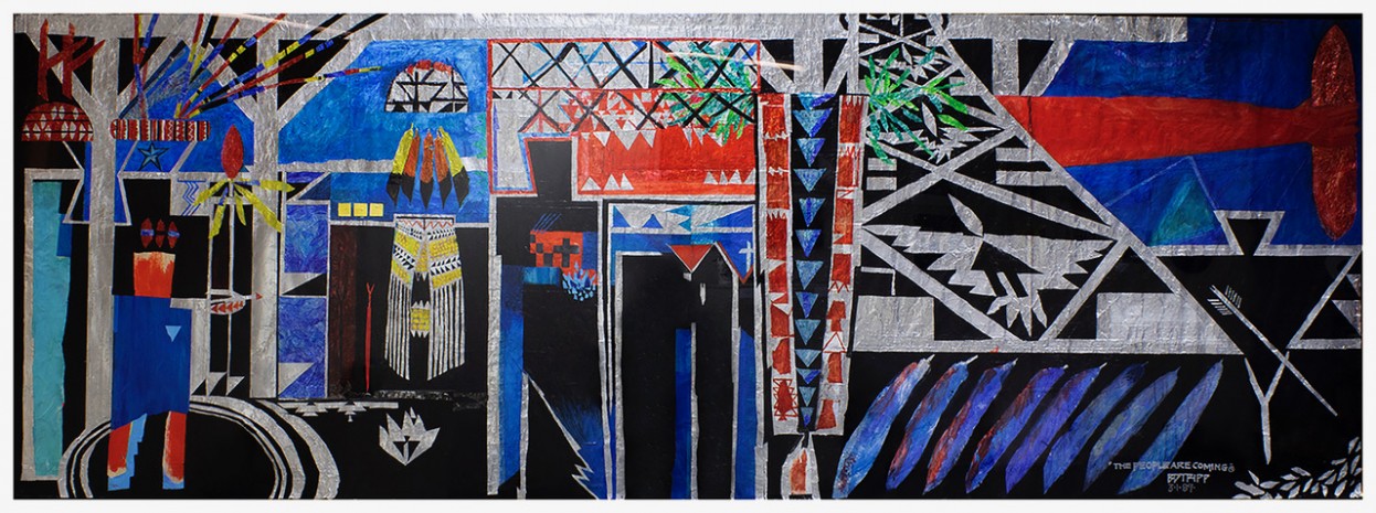 The People Are Coming, by Brian D. Tripp, uses a formal vocabulary derived from Indigenous basket-weaving motifs to show elements of ceremonial regalia bridging the gulf between present and past. Tripp, born in 1945 and a member of the Northern California Karuk tribe, has been active as a painter, sculptor, poet, singer, regalia maker, and activist since the 1970s.