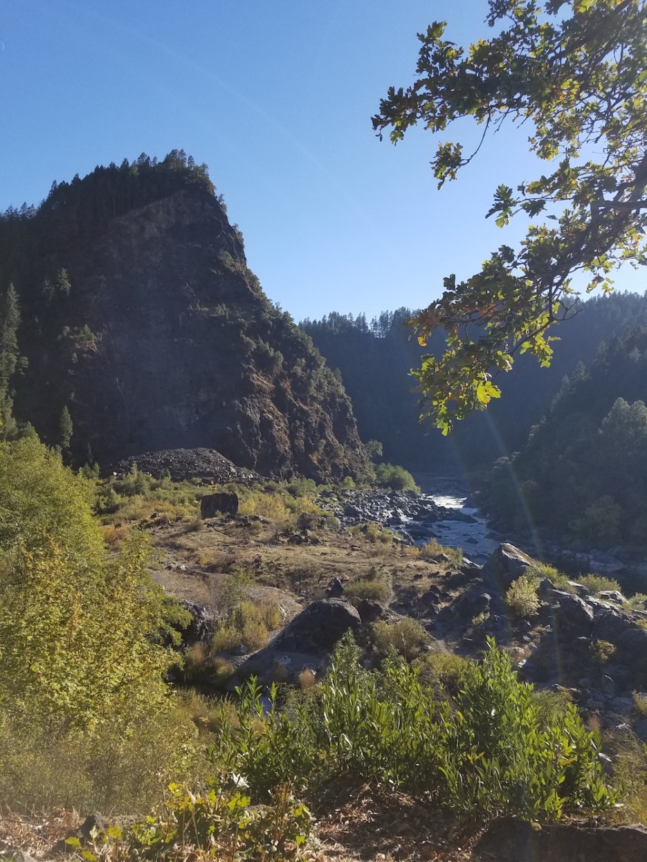 View from the dance pit at the Karuk village site of Katimín: the triangular crag Auwitch rises above Ishkeesh, the Klamath River, at Ishi Pishi Falls. Photo: Gabrielle Gopinath.