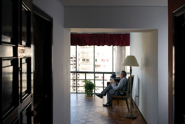 Sympathy for the Devil (2011) is a haunting peek at a commonplace interaction between two unassuming neighbors in a La Paz high-rise. The opening scene shows two elderly men passing each other, as one enters and another leaves an elevator. The man facing the camera holds his head high, averting the gaze of the other, who looks down. The former represents K. Altmann, the alias of Nikolaus “Klaus” Barbie, the German Nazi officer who earned the nickname “Butcher of Lyon” due to his torture of Jews and Resistance leaders in Vichy France. In the video, the second man represents an unnamed Polish Jew who immigrated to Bolivia during World War II and was allegedly Barbie’s neighbor, living on the floor below. The scene progresses like molasses, with almost indiscernible movement—as one might imagine feeling the time passing during such an uncomfortable situation. Did each of these men know the history of the other? Is Barbie’s distant glare evidence of hubris or humiliation?