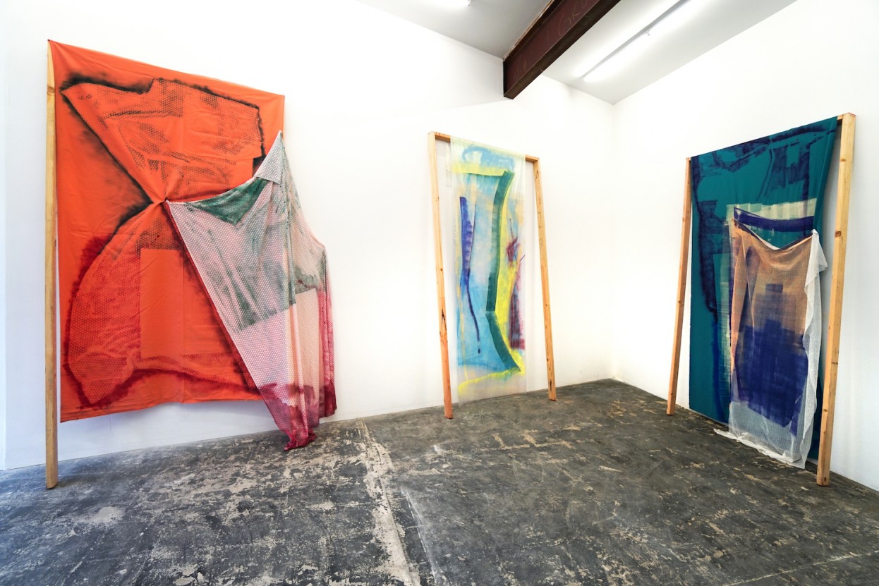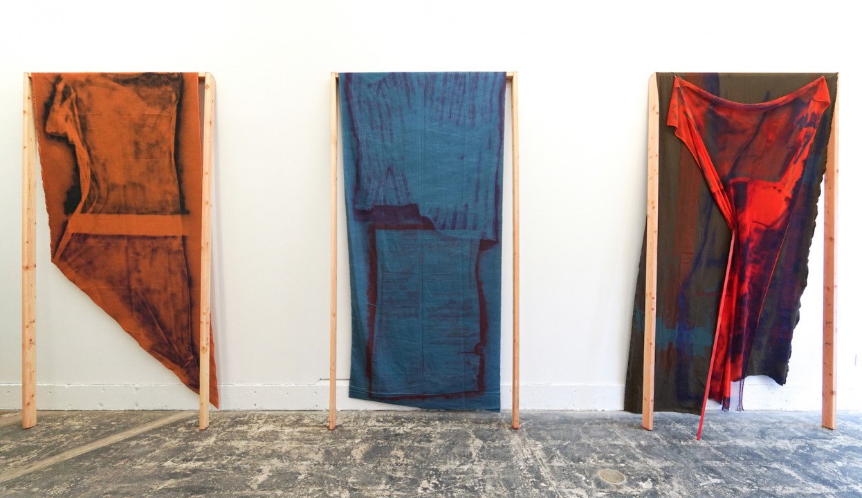 In the gallery, six rectangular wooden structures draped in layers of painted fabric lean against three walls. Each piece stands upright, approximately ten feet tall and five feet wide, occupying a space somewhere between painting and sculpture. Rather than being affixed to the walls, Lyle’s fabrics hang gently off movable posts that slant ever so slightly into the room, extending the space toward the viewer invitingly. The first piece, The Desert in Four Parts (1), consists of a warm-orange fabric rectangle with a white crocheted cloth slung on top and cascading down to the right. The two swathes of material are delicately attached together by a single safety pin in the center, creating a wrinkled pinch where they meet. Emblazoned on the orange fabric is an outline of where the crocheted one once hung; a smoky rim of black surrounds the outline, giving the impression that it has been burned. The result is an elegy to evidence.