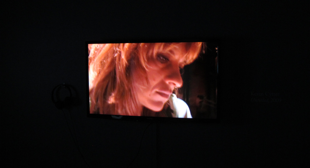 Shown as a large-scale projection, Richard Billingham’s Fishtank (1998) is shot as a home video and details the bizarre behavior of his own family. In Valérie Mréjen’s Pork and Milk (2004), the artist screens interviews with a number of young Israeli citizens about their transition from orthodox to secular lifestyles. Perhaps the subtlest and most isolated work in the exhibition—found in the space’s small hallway—is Mona Hatoum’s Measures of Distance (1989), in which Hatoum portrays how the Lebanese civil war affected a relationship between a mother and child in the mid-seventies. In the video, a series of still images slowly fade in and out while soft and earnest female voices narrate and converse in Arabic. However, the images and the voices are never synced, which serves to heighten and mirror the disconnection endured by mother and child due to the war.