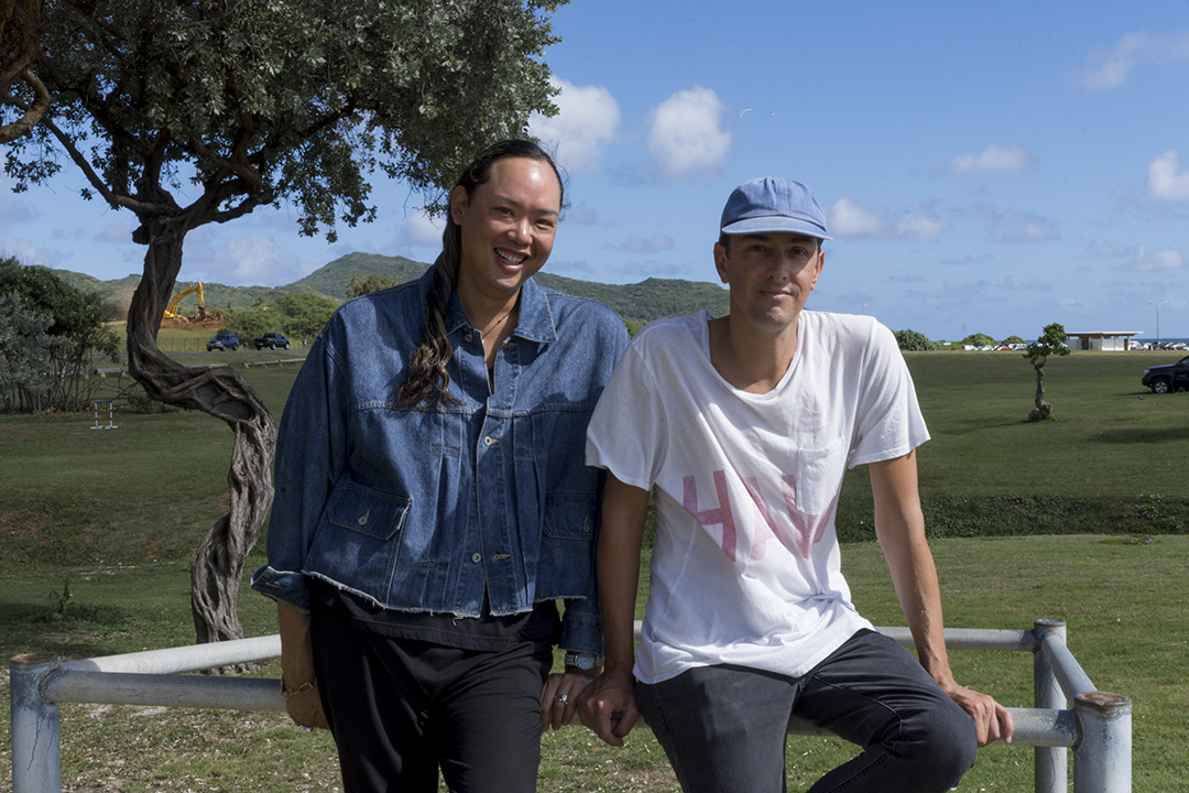 Aaron Wong (left) and Don Felix Cervantes (right) at Sandy Beach Park, Honolulu, January 2017. Courtesy of TRADES A.i.R. Photo: Drew Broderick.