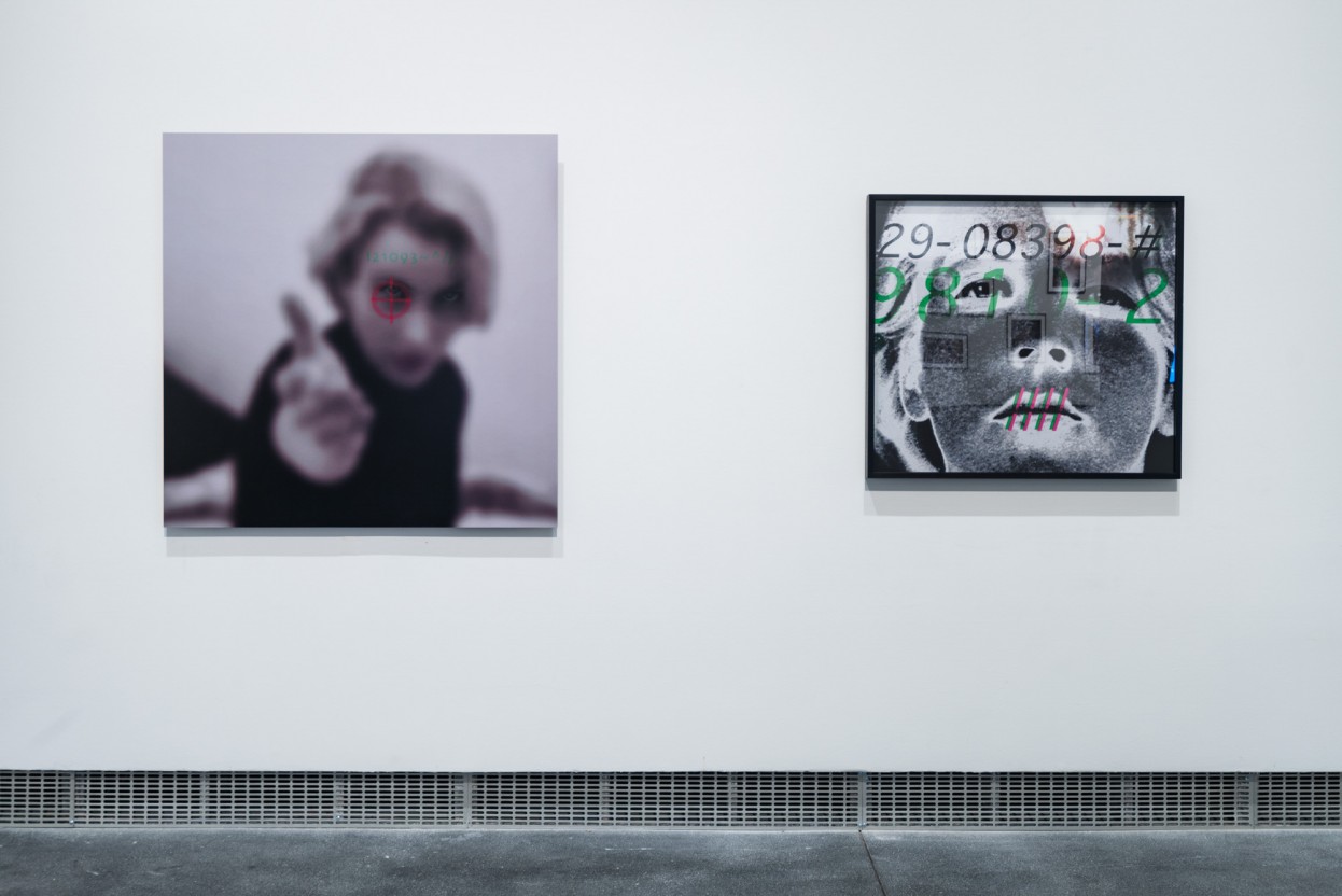 In contrast, Cyborg Series (1994–2006) presents a deeply menacing set of highly manipulated images. The work Identity Cyborg (1996) features a color reversal image of woman's face. Large graphically overlaid numbers suggest a cyborg's model or serial number. Like a social security number, Hershman Leeson evokes the ways that numbers can be used to track and surveil us, reducing our individuality to data. Additionally, simple graphic lines overlay her lips to suture them closed, indicating the violation of being silenced. Cyborg 9 (1999) presents a crosshair layered over a woman's eye, weaponizing her vision while at the same time suggesting her vision being the target. Adding to this duality, in the heavily blurred image her hand is outstretched in a way that beckons help while at the same time pantomimes a gun. The play of vision and visibility suggest both the predatory and vulnerable nature of today's or future technologies.