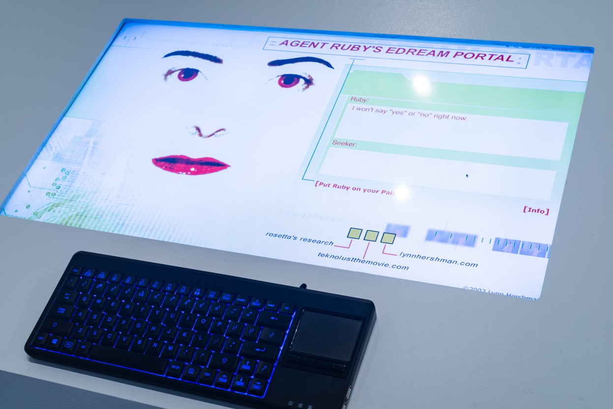 Agent Ruby and DiNA complement each other, but are much enriched after seeing Teknolust, which provides the foundation for these two character-based works. Agent Ruby conjures its historical and technological ancestor ELIZA (1964–66), developed by Joseph Weizenbaumin at MIT's Artificial Intelligent Laboratory. ELIZA allowed users to type questions into a computer as if they undergoing a psychotherapy session, where "the talking cure" allows patients to come to their own conclusions by talking through them. Based on this psychotherapeutic model and as a primitive form of AI, ELIZA's responses were simplistic. In the book Life on the Screen (1995) Sherry Turkle explains that users became accustomed to these rote responses, but still enjoyed using it to voice their concerns. In the "ELIZA effect," users of smart computer programs project their own hopes onto them and render them more intelligent than they are, which is most dramatically displayed in children. As an "edream portal," Agent Ruby follows ELIZA's use of technology for psychotherapeutic means where dream analysis can be a window to the subconscious. As Ruby becomes smarter and has moved beyond the film, into the gallery and online, Hershman Leeson nudges viewers to believe in her narrative beyond its fiction, possibly being as real as Roberta Breitmore. ELIZA and Ruby are a mirror, a bridge between human and machine, but also a dive into our subconscious and a leap of imagination.