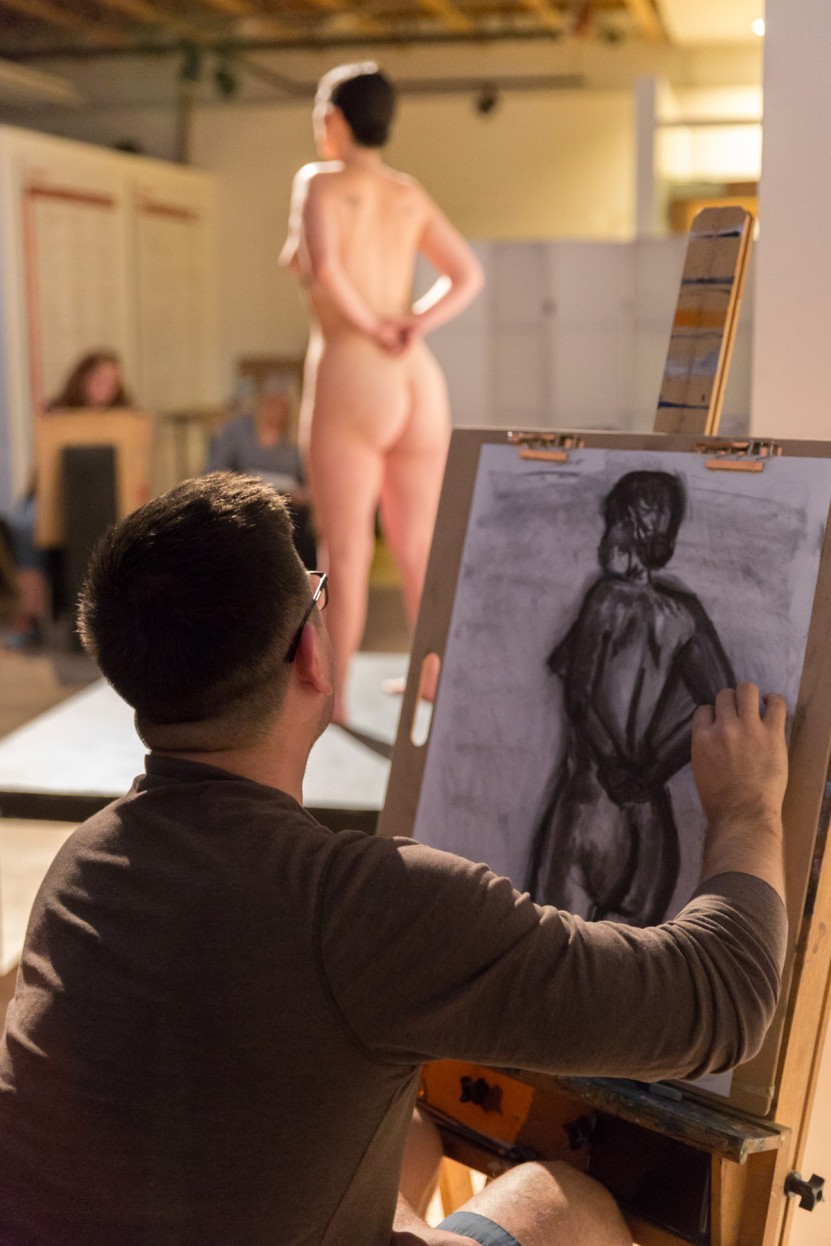 Artemisa Dolores Clark’s La Clase De Dibujo Libre/Free Drawing Class took place twice over the course of the PST Live Art LA/LA festival. Clark responded to artist Ema Villanueva’s project (2000-2004), which initially took place in public on the streets of Mexico City. Over the last year, Clark has staged several reinterpretations, including Villanueva’s, in an effort to explore reperformance as methodology. While Villanueva’s was initially held in the street, including on top of a police car, Clark reinterpreted the piece as a live drawing model in a gallery space with the assistance of the public. As with walking over Esparza in cumbre, spectators were not allowed to simply watch, but were called to create in a space that was also watching them create.