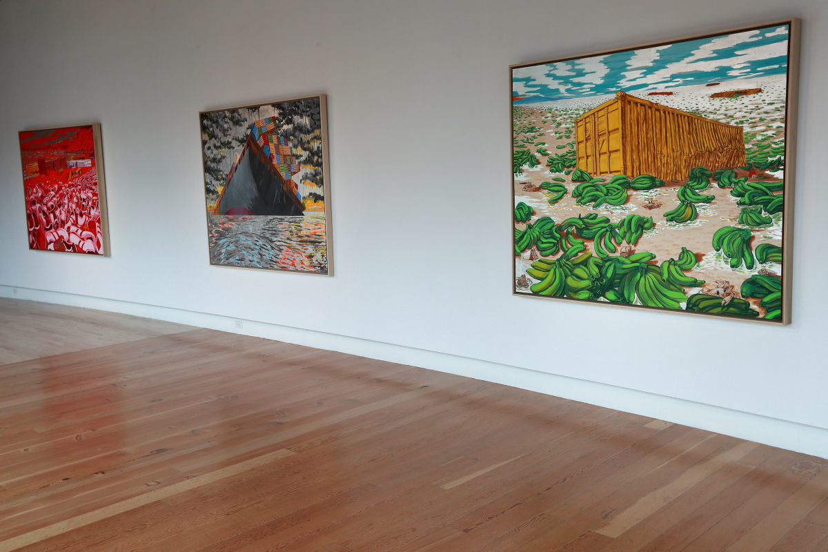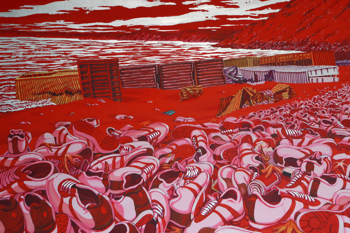 On the street-facing white wall of the gallery, a triptych introduces us to the immediate aftermath of collapse. The flanking panels overwhelm with excess: mountains of shoes and endless clusters of bananas spill from their containers and onto the beaches and shorelines of undisclosed Pacific Rim locations. Untitled 2 (2017), which features the shoes, is drenched in shades of red with silver foil shadows; it depicts a scarred and burned sky and sea, the 21st-century burning bush or an end-of-days punishment meted on false prophets and sinners. Untitled 3 (2017), which shows the bananas, is livelier. Among the unnatural additions to the seemingly barren landscape are scavengers of the crustacean and marine variety—sea turtles and crabs play about, one with a small Lego as its treasure. There is some hope in this painting, which is absent in the others; here, imported and discarded fruits have a better chance of being absorbed by the ecosystem. This load is far better than the usual Great Pacific Garbage Patch’s flotsam and jetsam of plastics and fishing ropes, which make their way to Hawaiian and British Columbian shores.3