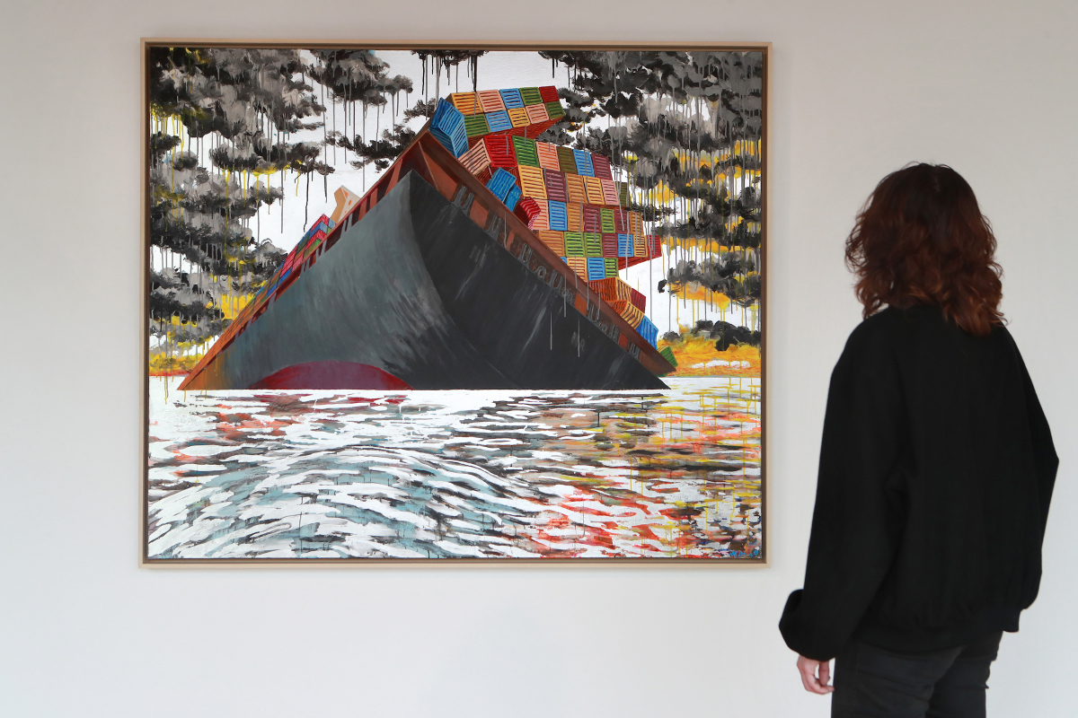The centerpiece on this wall is Untitled 4 (2017), which captures a freighter having nearly completed an untimely plunge into the ocean’s depths. From this impossible angle, the gray and red underbelly of the ship evokes an effaced Japanese flag: empire at its sunset. The disordering of perspective and stylization of the containers make Untitled 4 into a bridge between the relative realism of Untitled 2 and 3 and Untitled 1 and 5 (which are tucked into a darkly painted corner of the gallery that, rather than dimming the paintings, allows their gold and saturated colors to become transcendent). Untitled 1 and 5 are abstracted, a tidily considered juxtaposition within the strategy of such a survey. Together, Untitled 5 and Untitled 1 dazzle us in gold, red, and blue. Untitled 1, however, is the revelation; it is the alpha and omega of the series. In it, a bone floats above the scene, à la Stanley Kubrick’s 2001: A Space Odyssey, though it’s unclear if we are witnessing the end or beginning of the world. The containers are locked together like Transformers, rising out of the primordial gold where sky and sea have become one.
