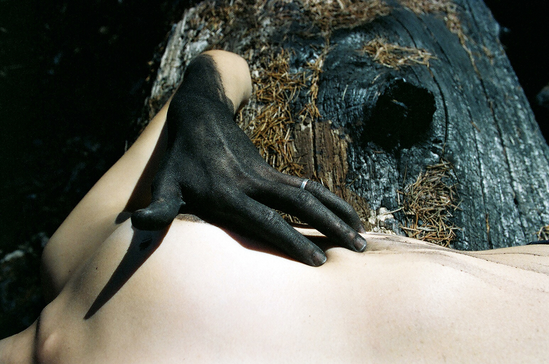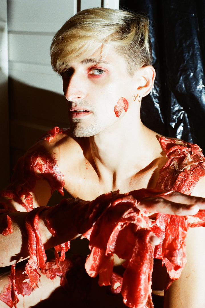The glossy and futuristic photos by Miss Prys exist simultaneously alongside the subdued and reverent corporeal landscapes by Jenny Olsen. Both are glamorous and visually representative of a body’s location relative to the space it occupies. Each is sexy and contemplative in its own respect. Some of the exhibition’s photographs, like the polaroids of Williejane Dent and the portraits by Krystyna Solodenko, shine in their sincerity, like outtakes from a project done among close friends. Photos shot by Jess Garten, Rachel Lily, and Danni Ordoñez are more overt and seductive. Unsettling and provocative, they’re designed to rattle and captivate the audience, much like the shot by Garten of a young individual posing, adorned with raw meat. Particularly with the work of Sevin Mundo, their juxtaposition of fake gore and real weapons is an anomaly in the show that toes the line of comfort in a more glaring manner.
