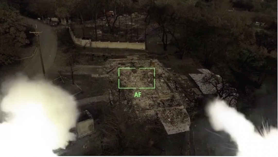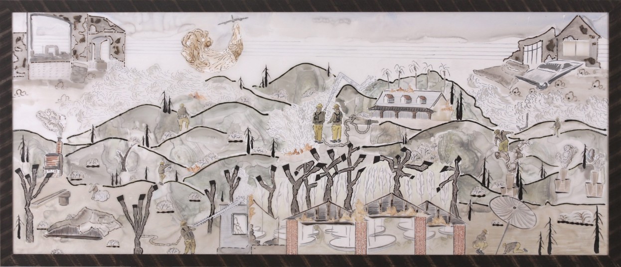 He Kunlin. No.1 California Wildfire 2017, 2018; acrylic and ink drawing on three layers (muslin, mylar, and acrylic sheet); 30 x 72 in. Courtesy of NanHai Art. Photo: Paul Hsu.