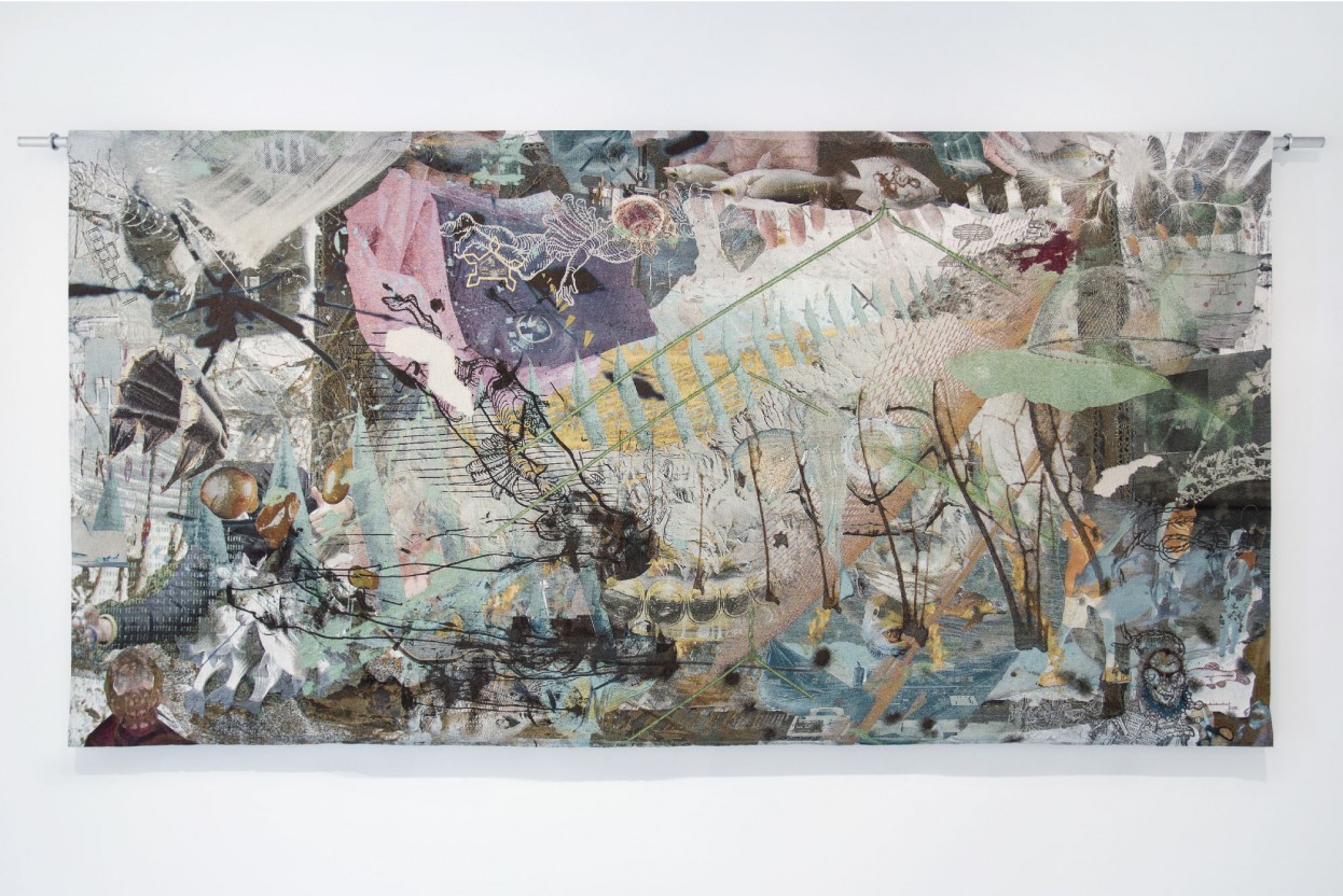 Tong Yi Xin. Animalistic Punk - Fish, 2018; jacquard tapestry, galvanized metal tube, steel eye bolts; 54 x 108 x 3 in. Courtesy of NanHai Art. Photo: Paul Hsu.