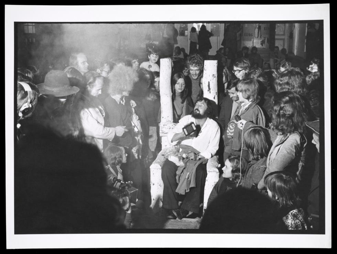 Harald Szeemann (seated) on the last night of Documenta 5: Questioning Reality–Image Worlds Today, at Museum Fridericianum, 1972. The Getty Research Institute, 2011.M.30. Photo: Balthasar Burkhard.