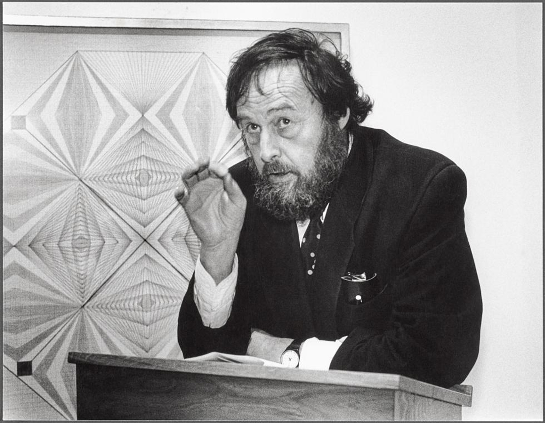 Harald Szeemann lecturing in front of Werk Nr. 003 (undated) by Emma Kunz, n.d. The Getty Research Institute, 2011.M.30. Artwork courtesy of Emma Kunz Zentrum. © Anton C. Meier.