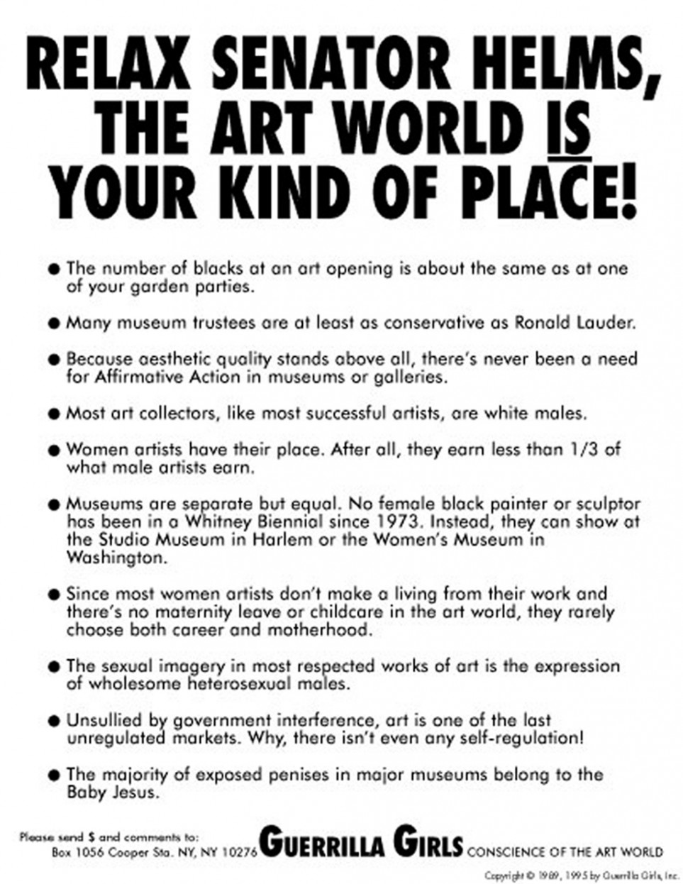 PW: Artists were silent for a long time during the Helms amendment on censorship. But once artists understood that their profession was in trouble, they sent more mail to Congress over two years than it had ever received. More people go to art galleries and museums than go to all of the National Football League and Major League Baseball games combined. [The art audience] is an incredible force.