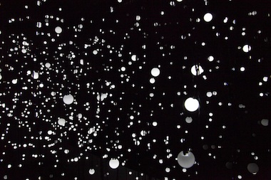 Jim Campbell: It’s a large work, about twenty feet wide, twelve feet deep, and twelve feet high, and it’s installed about sixteen feet off the floor in the lobby in SFMOMA. I would say the most interesting thing about it is when you see it from the lobby area, it’s completely abstract, and it’s not until you climb the staircase and look at it from the landing that the image resolves itself. It’s a low-resolution work of the kind that I have been working with for the last ten years. There are three thousand lights, each about one inch big; each light is suspended on its own wire from above to create this randomized three-dimensional grid. Each light flickers like a pixel, so together they resolve as an image.