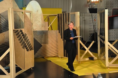 The film production became a really important metaphor for me, as the idea of building a project around a structured thematic process of working. Over a period of three days in 2009, we did a film shoot in the Schwab Room, which is adjacent to the lobby. I had made these sculptural pieces, which were essentially abstractions of the very iconic architecture of the museum. They acted as scenery flats and doubled as secondary characters in the film production. They also provided the backdrop and the structure for working with the idea of something being in flux and of the film production as a process of making layers of work with other people. We invited the philosopher and theorist Judith Butler to give an experimental lecture within our film production. She is well known for her work in performativity and investigations of subject formation through the speech act. When we approached her, she was excited about the notion of layering different people’s practices as well as embedding ideas that she’s been working with inside this other project.