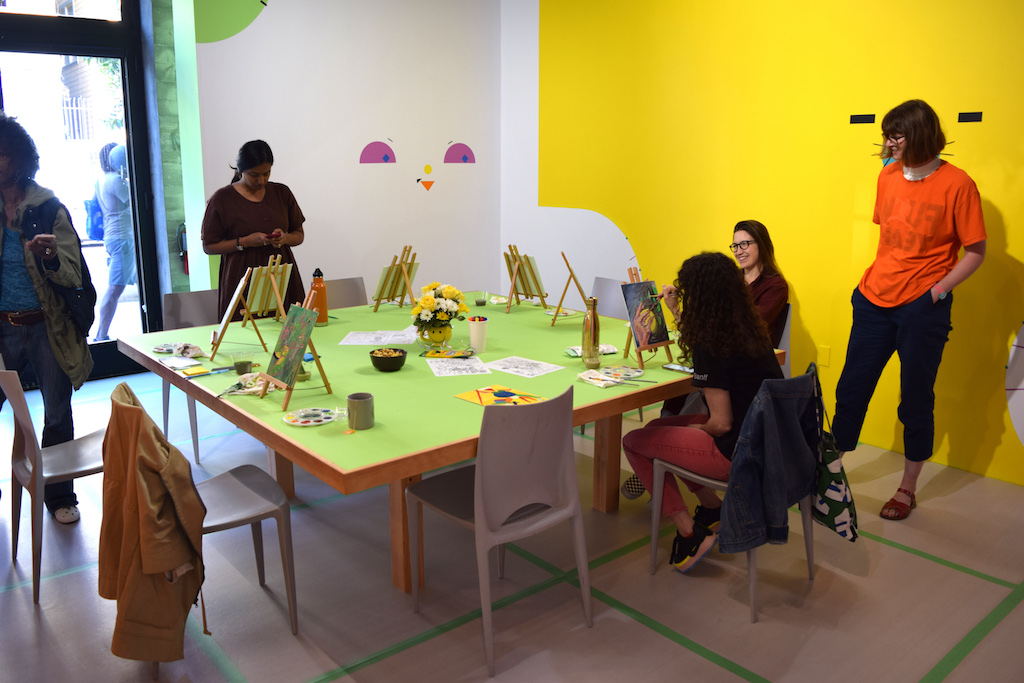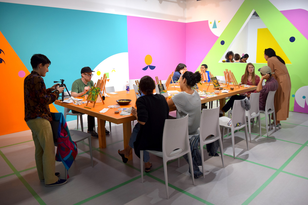 The Feminist School of Painting currently on display at KADIST is, on one hand, a solo exhibition by the Argentinian artist Ad Minoliti, who trained as a painter. On the other hand, it is also an experiment based on the pedagogical principles of the artist and educator Diana Aisenberg and a “performance that begins with open questions: What would happen if…?”1 The titular School is rooted in a series of seven free workshops held at KADIST, in San Francisco, every Saturday from October 6 to November 17, 2018. Each workshop is conceived in collaboration with an interdisciplinary group of Bay Area–based artists, scholars, educators, and writers, and each takes different canonical genres of painting—for example, portraiture and landscape—as points of departure for subversive re-imaginings of a visual language that continues to be weighted by patriarchal formalism and restrictive binaries.