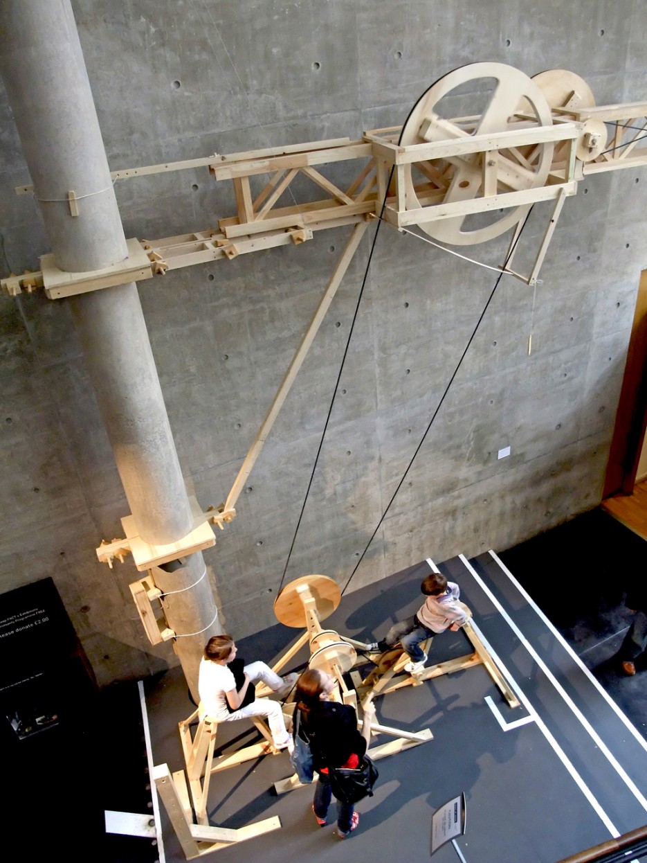Lubell’s A Theory of Entanglement is an elaborate yet low-tech wood construction that references string theory and economics. With a set of two bicycles and a couch, the participants must cooperate to power the giant knitting machine hung from the ceiling in a large foyer at FACT in Liverpool, U.K.2 Lubell creates a physically active diagram, as a model for capitalism, that positions the bicyclists as laborers (literally providing the energy to power the contraption), the couch sitters as capital (whose inactivity and physical weight activates a clutch to cause the machine to engage), and the knit tube as product. Like the economy, the elaborate and sprawling machine dwarfs the three or more individuals who operate it. As riders and sitters labor, the machine’s gears and pulleys grown to slowly knit a loose black tube, reminiscent of graphic depictions of black holes.
