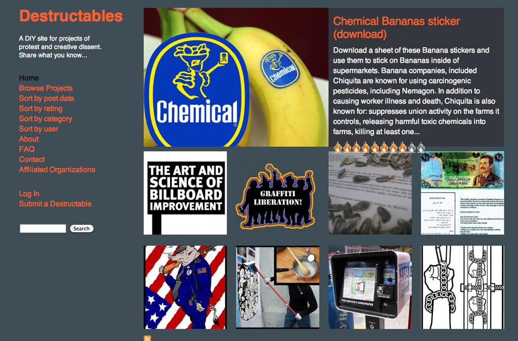 Though based online, Jennings’ Destructables also employs relatively low levels of technology to engage his viewers in direct action as economic agitators. Rather than providing directions for simple and affable DIY craft or science projects like Instructables (an online DIY site that seeks to expand knowledge and craft), Jennings’ Destructables instructs viewers in disrupting or subverting economic, political, or social systems.5,6 Jennings describes Destructables as,