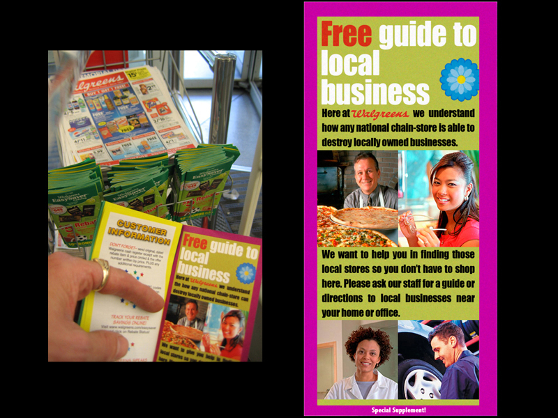 [h]ere at Walgreens we understand how any national chain-store is able to destroy locally owned businesses. We want to help you in finding those local stores so you don't have to shop here. Please ask our staff for a guide or directions to local businesses near your home or office.11