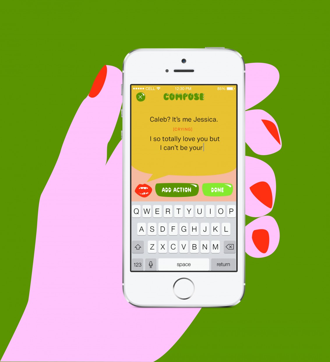 Just as some of us use emoticons and extraneous punctuation to impart tone in our emails and texts, Somebody includes a menu of inflections or accompanying gestures—including nervously, crying, hugging, kissing, etc. In addition to selecting from the prescribed options, users can customize their delivery approach. By designating the gesture and tone, the sender takes on an almost directorial control of the delivery, transforming it from the strict transmission of information into a potentially theatrical moment. Depending upon the message’s content and delivery style, its emotional weight could be mitigated or enhanced. July expands communication beyond written text to suggest the importance of our bodies in displaying and receiving information.