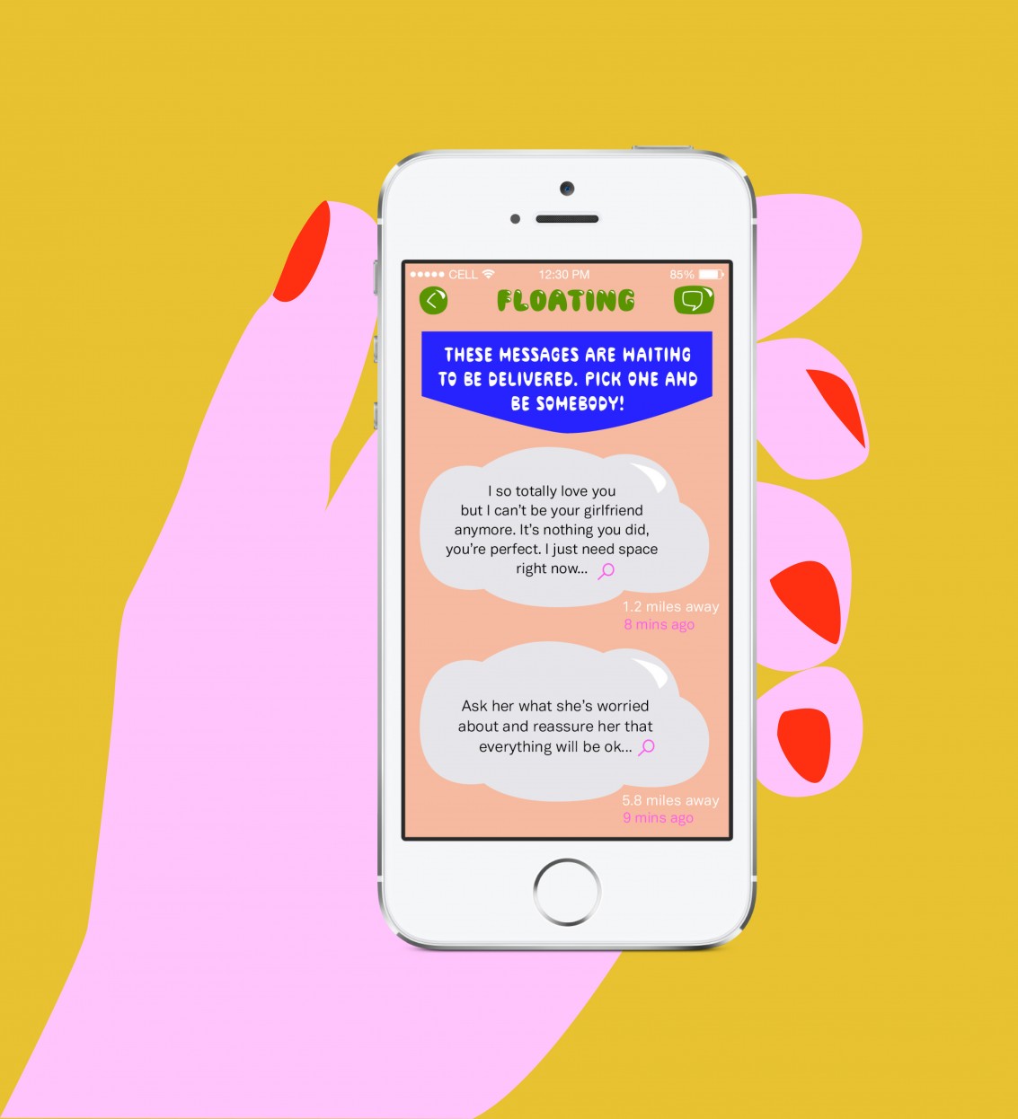 In allowing users to conveniently communicate with those not immediately around them, email and texting2 eliminate or ignore users’ physicality. In contrast, Somebody interjects the body by requiring that two of the participants (deliverer and receiver) be physically present and available. Using the GPS on smartphones, the app locates the message recipient and deliverer based on their proximities to the sender. The app indicates participants’ distances down to a tenth of a mile and displays their photos. The project develops radiating circles of engagement, with the author and recipient at the core, and integrates a third party who delivers the message. If message writers can’t find an available deliverer or choose not to have it delivered, they can allow it to linger on the app by “floating” it. Any user in the area can volunteer to deliver “floated” messages. When a message is “floated,” its network expands beyond three people to include the community of Somebody users for an indefinite amount of time.3