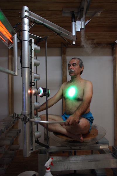 Commissioned for Performa 11 (2011), Rottenberg and Kessler produced SEVEN at Nicole Klagsbrun Project Space. The artists mix references to spas, factories, and laboratories as places that attend to, are dependent upon, and investigate the body. The performance begins with seven actors dressed in white terrycloth robes waiting in a room, as if at the spa. With the regimented timing of a factory or laboratory, the actors punch a time clock and have a specific chakra extracted from them eight times a day, four days a week, for three weeks. In another portion of the gallery, the charismatic scientist “Empress Asia” attends to an elaborate laboratory with beakers, test tubes, and mysterious machines and fluids. At the heart of the performance is a bicycle-like contraption that, when pedaled, powers the “chakra juicer,” a glass-enclosed sauna where a sweating actor sits in lotus position. The subjects are panned across by a scientific-looking unit housing a camera with a vertical series of lights in the seven chakra colors (violet, indigo, blue, green, yellow, orange, and red). The device somehow culls the chakra from the actors while the video camera records the process. As some actors’ bodies exert energy to power the mechanism, others sweat to create a circular process of physical labor and production. This physicality adds to the project’s intensity and duration, which pushes the actors’ physical and, possibly, psychic endurance.