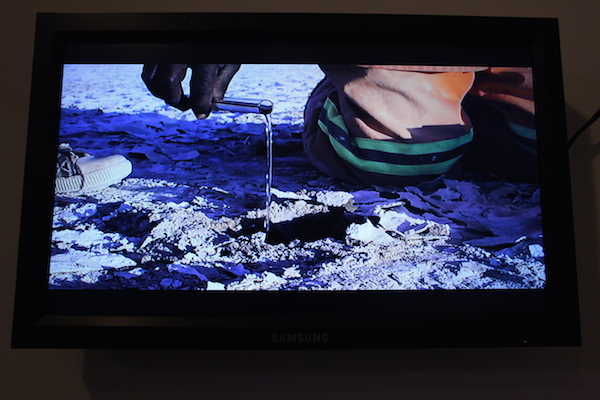 After “Empress Asia” extracts and processes the sweat, she teleports it to a small village on the African savannah. Video monitors display footage of the African cohort as some quietly watch and others examine the chakras and dig a hole in the ground. On a dry salt flat, an actor pours the chakras into the hole, returning them to the anthropological origins of civilization. With simple computer graphics, the ground bubbles up in a rainbow explosion of energy as multicolored, tweeting birds encircle the blast. The African villagers and their New York counterparts applaud, suggesting the healing or cyclical unity of humankind and the earth. In mixing Eastern understandings of the body, pseudo-modern science, and anthropological references, Rottenberg and Kessler playfully indulge in and critique each with their elaborate systems of meaning and cosmologies.