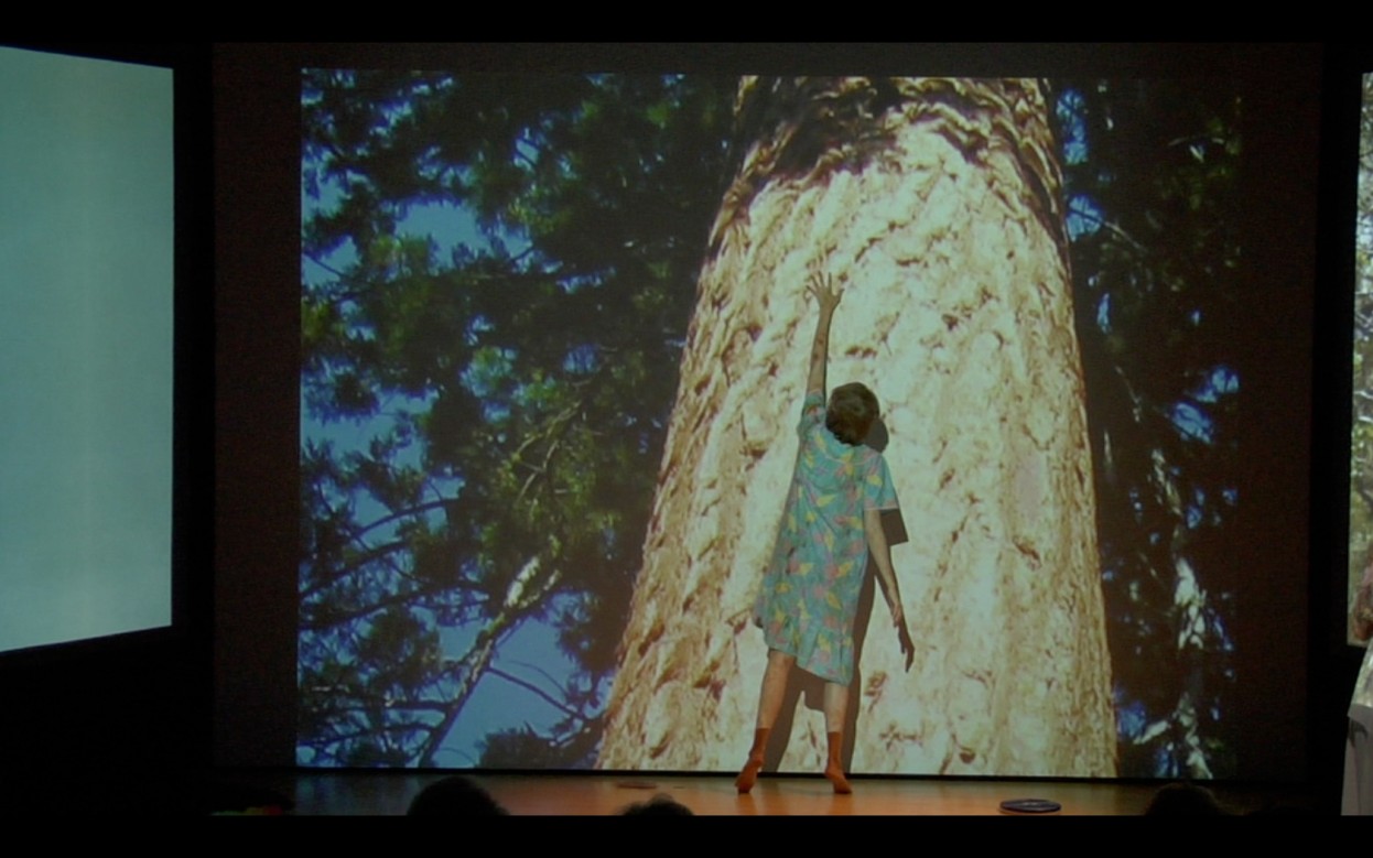 While Cynthia toggles back and forth between her physical body and imagination, the piece’s narrative culminates with video of her body falling from a tree. As Cynthia’s body smashes into pieces in the video, on stage she lies on the ground. With the video transforming into a computer monitor and keyboard, the default “Aurora” Apple wallpaper fills the background. Two enlarged images of Cynthia with bandage-like Biore pore strips on her nose flank the screen. The video transforms to simply rendered footage of Cynthia’s fragmented body gravitating to the gauze square on an enlarged Band-Aid. Moulton and Hallett create a narrative of transcendence, in which Cynthia’s body is, while disjointed, somehow healed with drug-store health and beauty items. This unity occurs in the virtual space of the computer monitor, another screen where imaginative or escapist narratives occur.