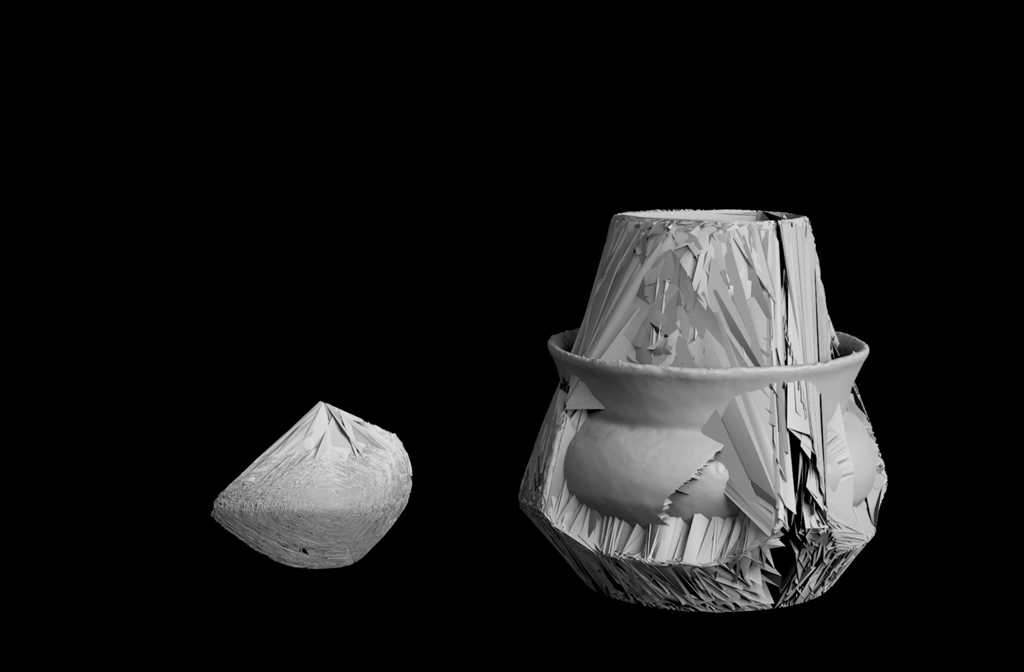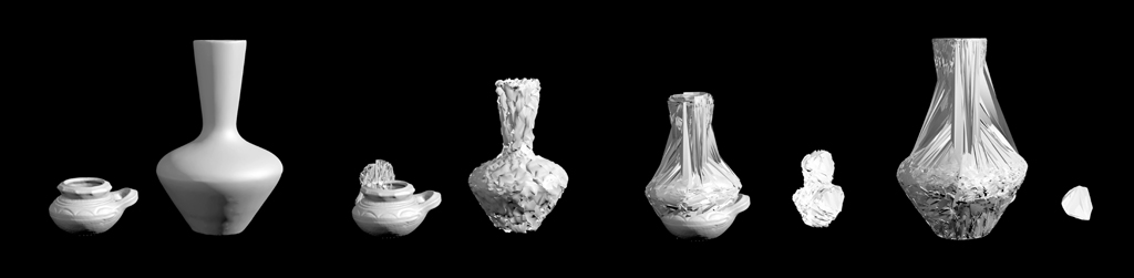 Even before Syjuco morphs her vases, the scanning process simplifies the vases' forms, reducing the detailed marks of their age, condition, and the artisan's hand. Additionally, Syjuco has rendered them in tonal grays, which eliminates the color and characteristics of the vases' glazes and surface treatments. Much like the online photographs Syjuco used as source material in RAIDERS, here, 3D scanning also operates as an indexical format.