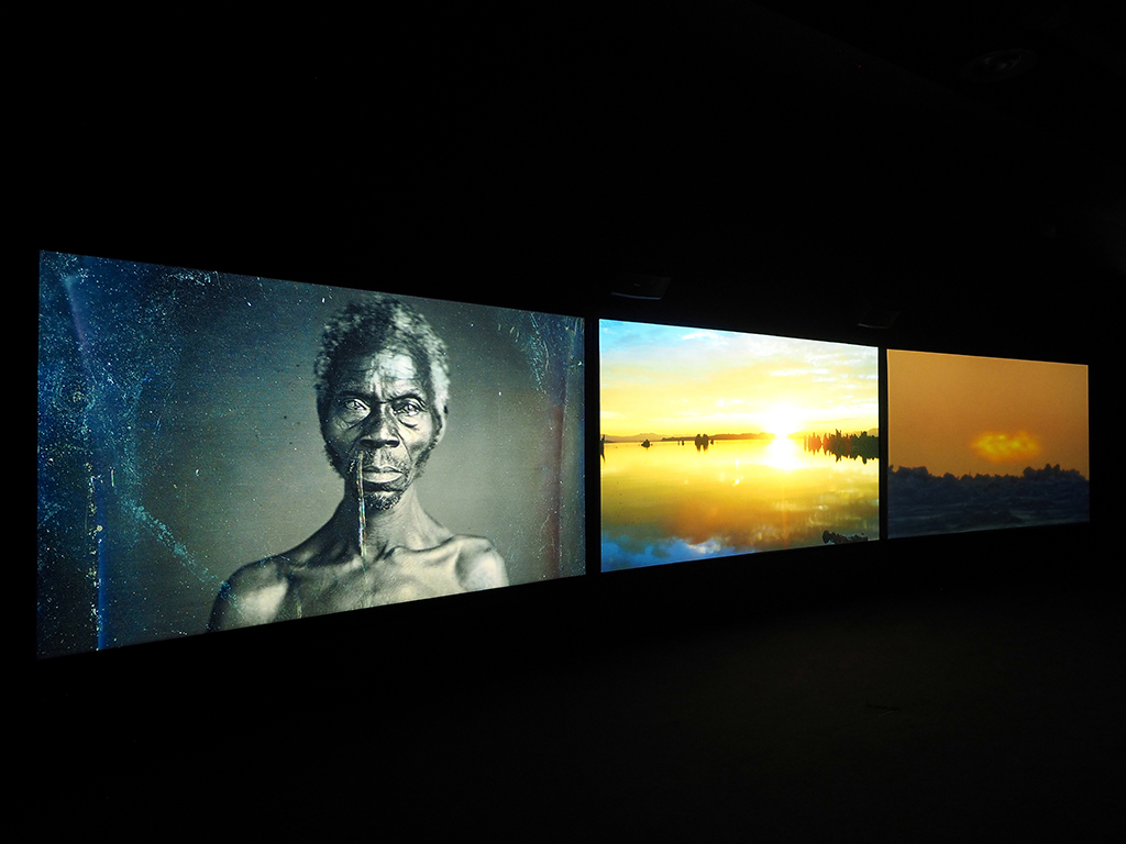 Sublime Seas is the US premiere of Ghana–born, British artist John Akomfrah’s 48-minute, 3-channel film, Vertigo Sea (2015). The work could be described as a hybrid film essay, natural history documentary, and visual poem. This audiovisual and conceptual triptych interweaves original cinematic footage, archival material, and texts by Herman Melville, Virginia Woolf, and Ralph Waldo Emerson, among others, to trace linkages between the ways in which different kinds of bodies move, are moved, disappear, or are traded in the animated palimpsest of the ocean.