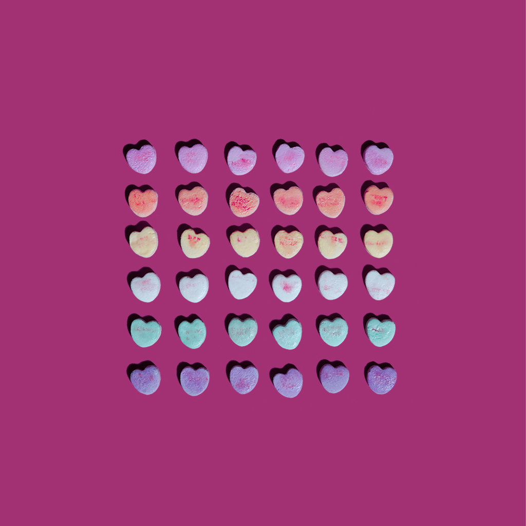 One of the most vibrant pieces, Modern Love (Lost in Translation) (2018), depicts rows of heart-shaped candies, or “conversation hearts,” usually sold for Valentine’s Day, arranged in a square against a bold purple background. What would be a symmetrical paragraph of sweet, romantic words literally blurs and fades within each row of Lamb’s image, as the candies’ texts (“kiss me” and “be mine”) are progressively smeared to the point of illegibility. This once cute and common way to communicate to a special someone has become unrecognizable; as her title indicates, Lamb renders the intended messages as “lost in translation.” This poppy image turned into a futile and faded exchange, combined with its title, mirrors the way communication in intimate relationships, especially via technology, can at times be challenging—like when a text message that was sent in jest is received incorrectly.