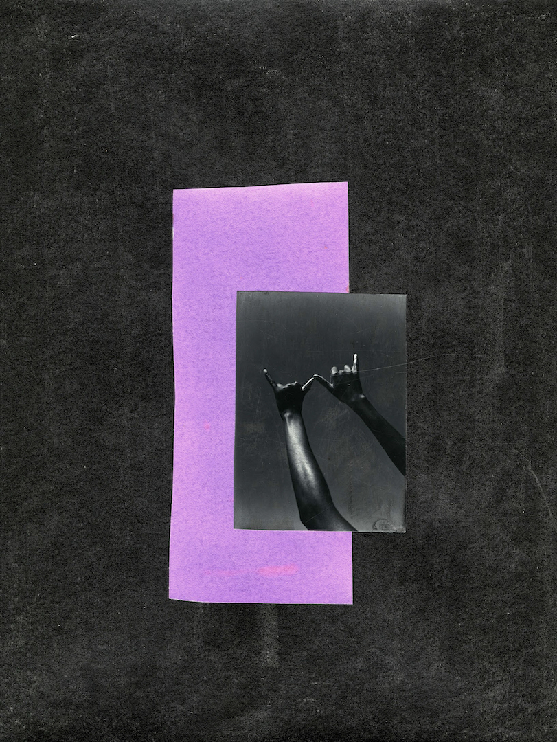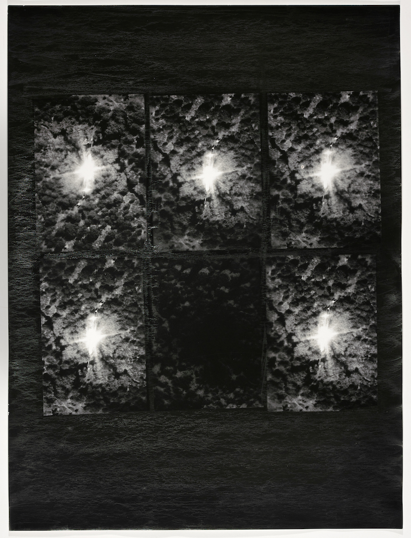 Even as an Oaklander dependent on trains, phones, and the rest of it, Lee simultaneously seeks knowledge about the natural world. She compiles images from, or inspired by, her collection of treasured how-to manuals for wilderness survival into what resemble the pages of a scout’s well-loved scrapbook. In the darkroom, Lee collages these images into black-and-white prints, sometimes reverting tones or solarizing the photosensitive paper by bringing the unfixed paper into the light to slow down the development process. A pinkish-purple rectangle of unfixed paper sits at the center of North (2019), which Lee has overlaid with an image of her hands held toward the sky, thumbs touching, which is a technique for measuring the distance between the Big Dipper and the North Star.