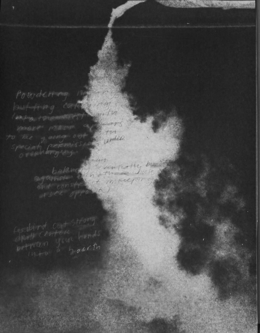 Lee writes and draws directly onto photo paper with graphite, dodging words or lines during the exposure process to create gradient effects. For Between your hands in a hearth (2019), she writes short directions for firestarting on the paper before exposing it to an image of a smoke spire. Blurry and grouped from disparate passages, the words are no longer instructions a reader can logically follow, but are annotations that Lee made for herself. The personal, handwritten jottings are direct transmissions of knowledge from the artist’s head, where it is available should she need to make a fire without matches or a lighter.