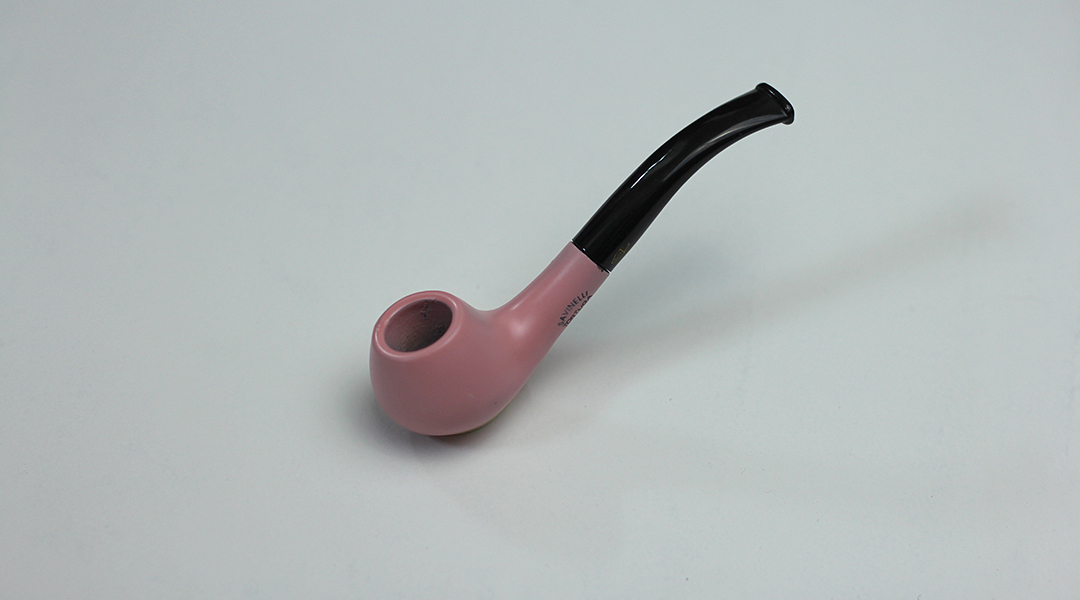 In Hobbs’s readymade sculpture Ancestors (2014), his intention is to acknowledge the long lineage of readymade and surrealist artists, highlighting Dadaist Marcel Duchamp and surrealist René Magritte through the iconic symbol of the smoking pipe. Hobbs painted the plump bowl of a pipe pink, rendering the object fleshy; the stark black half-bent stem is ready to be inserted into the mouth and smoked—slowly, with short and rhythmic puffs, I imagine. On the side of the pipe, the words “Savinelli Tortuga” mark this as a high-quality luxury pipe from a Milan company started in the late 1800s. For me, the interplay between Hobbs’s phallic pipe and the soft, bulging pink bowl denotes a flaccidity of the object, while staying in conversation with the lineage of the readymade object. Ideas of ineffectiveness—the original purpose of the object has been changed—are embedded in the straight white cis history of the readymade and can be seen in Duchamp’s sculpture Fountain (1917). Duchamp’s work turned a urinal on its side, rendering it useless for its original purpose, but marking it as art. Hobbs relies on adding feminine color to render the object impotent, rather than simply altering the pipe by forcing the object useless like Duchamp.