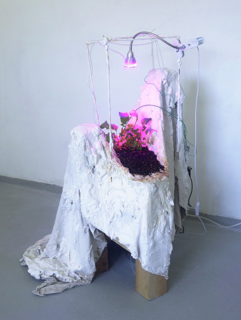 Taking Wiener’s theory as its title, Bartz’s Cybernetic System (2018) operates a feedback loop to autonomously water a plant. The sculpture is a wooden, cement-covered structure that holds a small amount of soil and radish seeds. It contains a microcontroller that executes a code to a sensor inserted in the soil, which continuously checks its moisture level. When the moisture of the soil drops to a certain threshold (pre-determined by Bartz) the microcontroller triggers a pump that dispenses water until it detects the soil is no longer dry. A grow light toggles on and off for ten-hour stretches, and these light and water processes continue as the plant grows.