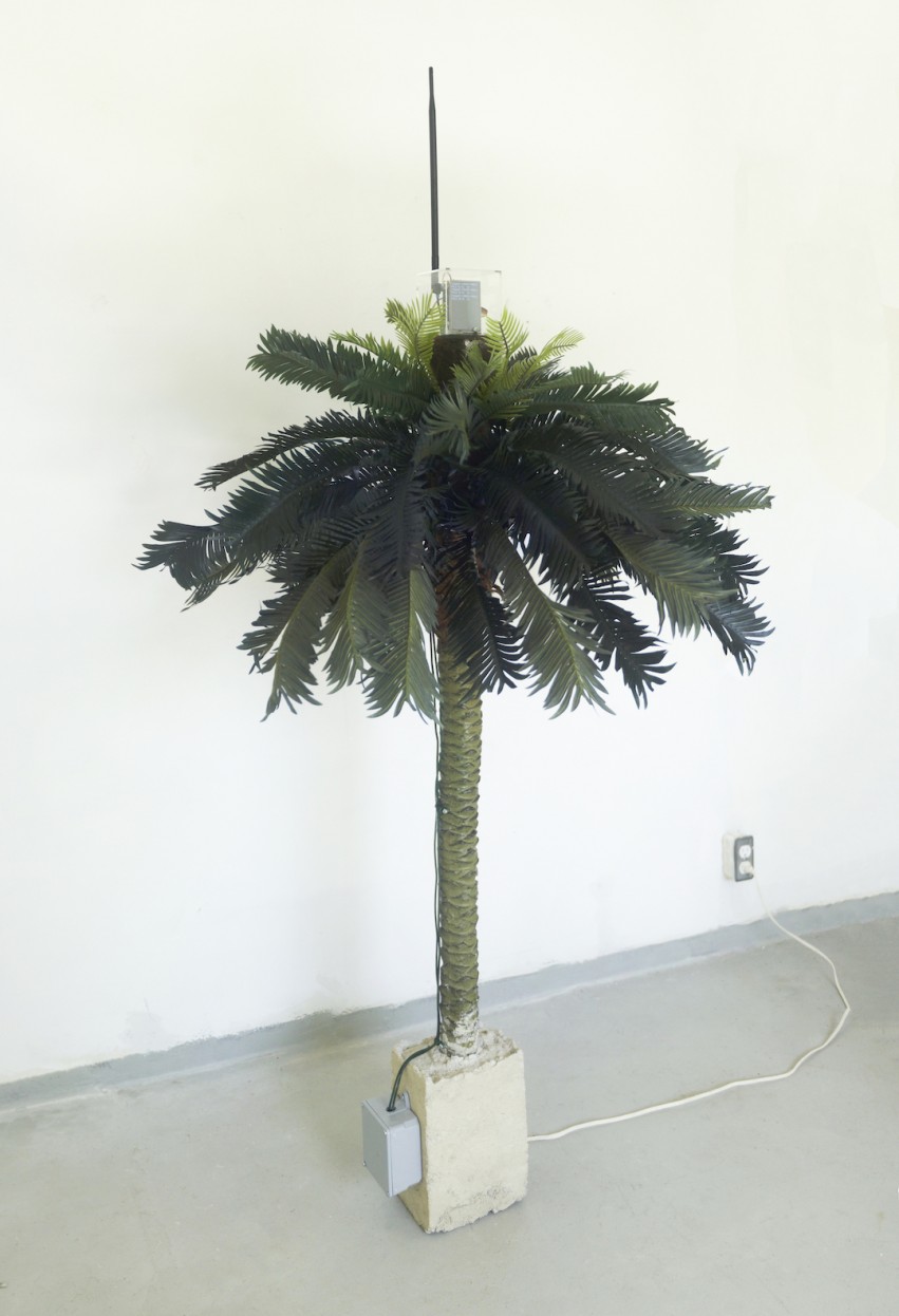 With Antenna Tree (2019) artist Brian Bartz has fabricated a miniature version of these devices: a palm tree that stands a bit shorter than human height, whose top branches meet most viewers’ eyes. Like its full-scale counterparts, Bartz’s tower is a conduit for SMS messages. It receives and sends them from the small computer embedded on its leafy head to viewers who text the number etched on its side. The computer contains a folder of 90 images that depict the full-sized towers (upright palm and coniferous varieties are the most popular) and it messages out a randomly selected photo to every phone that messages it.1