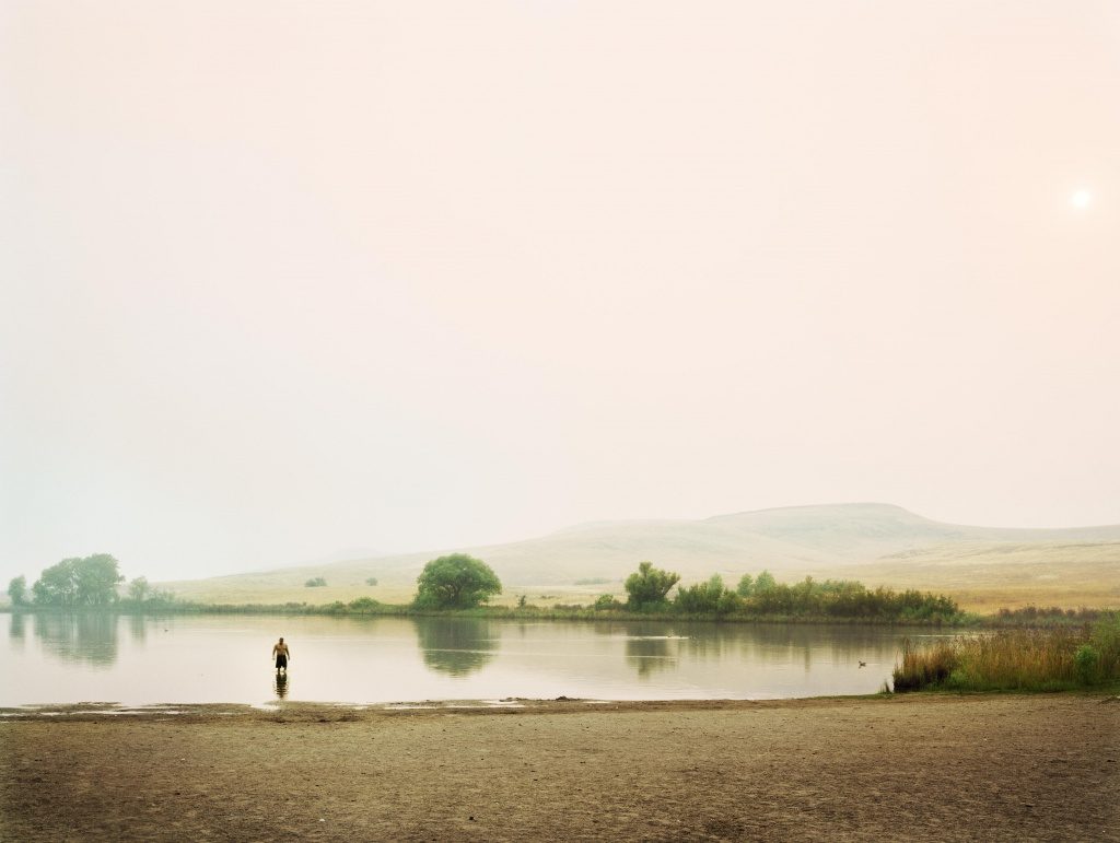 Suh’s photographs may not erupt with firestorms, but they do burn. They push against a news cycle that must turn its lens to the next tragedy; they insist that wildfires are not over when a destructive spectacle has been contained. Suh’s photographs underscore how closely Northern Californians coexist with the specter of wildfire. The landscapes in his work are both calm and in crisis. His images evoke a cognitive dissonance that recreation—boating, camping, swimming—easily happens downwind from a nearby wildfire, that life continues alongside a proximate tragedy. In Bather at Sunset (2009), a swimmer enters a shallow pool of water, reminiscent of idyllic style of Hudson River School painting, which Suh cites as influential to his work. Indeed, the photograph’s color palette and softness do recall such works, with their warm pinks and oranges as gradients in softly majestic sunsets behind lush, muted landscapes. With a different project title, these photographs could too be considered idyllic. This is what continues to draw the viewer: that within tragedy and destruction can exist something surreally attractive, a scene so beautiful and so strange that it calls to be inhabited and photographed.