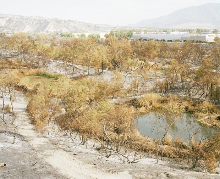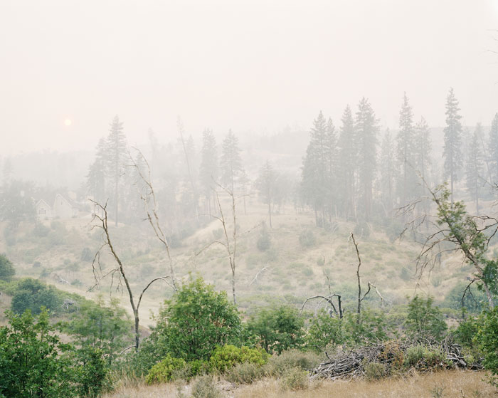 The works in Wildfires were photographed between 2008 and 2013. Suh tracked active wildfires online and through news reports, photographing not the blazes themselves but rather the surrounding landscapes. Suh also worked with local firefighters and forest-management agencies to gain access to controlled burn sites. These agencies attempt to temper the severity of future wildfires through preset burns that exhaust the available fuel: brush, leaves, and branches left behind from winter and the dry season.