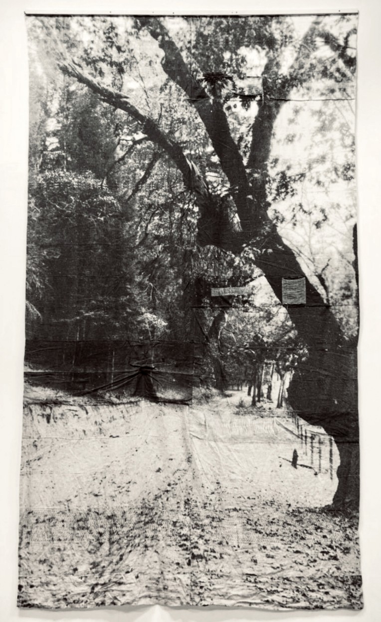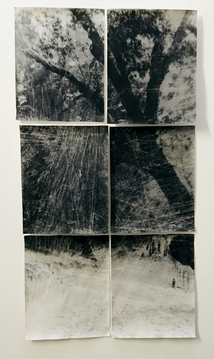 Reskala often reuses images across different works, a manifestation of the cyclical quality of both memory and daily routine. Untitled #18572844 (2019) and Untitled #152392 (2016), for example, depict a fence-post-lined trail with a large, silhouetted tree in the foreground. This trail, reminiscent of one that might be revisited on regular walks, seems electrified; it vibrates with allusions that this spot holds more than it reveals, something beyond its surface. The artist’s slight camera shake produces an unstable, resonating blur while shadows obscure the image, evoking a haunting quality. In Untitled #152392, this scene is digitally printed onto a large piece of linen that drapes on a wall and cascades to the floor. The wrinkled surface of the textile adds a sculptural quality to the two-dimensional image. Unraveling threads suggest a simultaneously destructive and deconstructive mark while embroidery throughout the work both enhances and obscures the composition. In Untitled #18572844, the photograph is rendered as a grid of six 16-by-20-inch gelatin silver prints. The grid is prominent; its seams are visible, as edges of the paper curl outward. In this piece, Reskala addresses the fragmentary, elusive nature of memory. Some prints within the grid are heavily scratched, which suggests gestures at once of redaction and of reaching, as if attempts to return to sites of memory only obfuscate its traces.