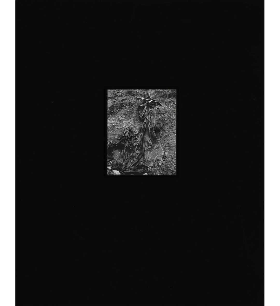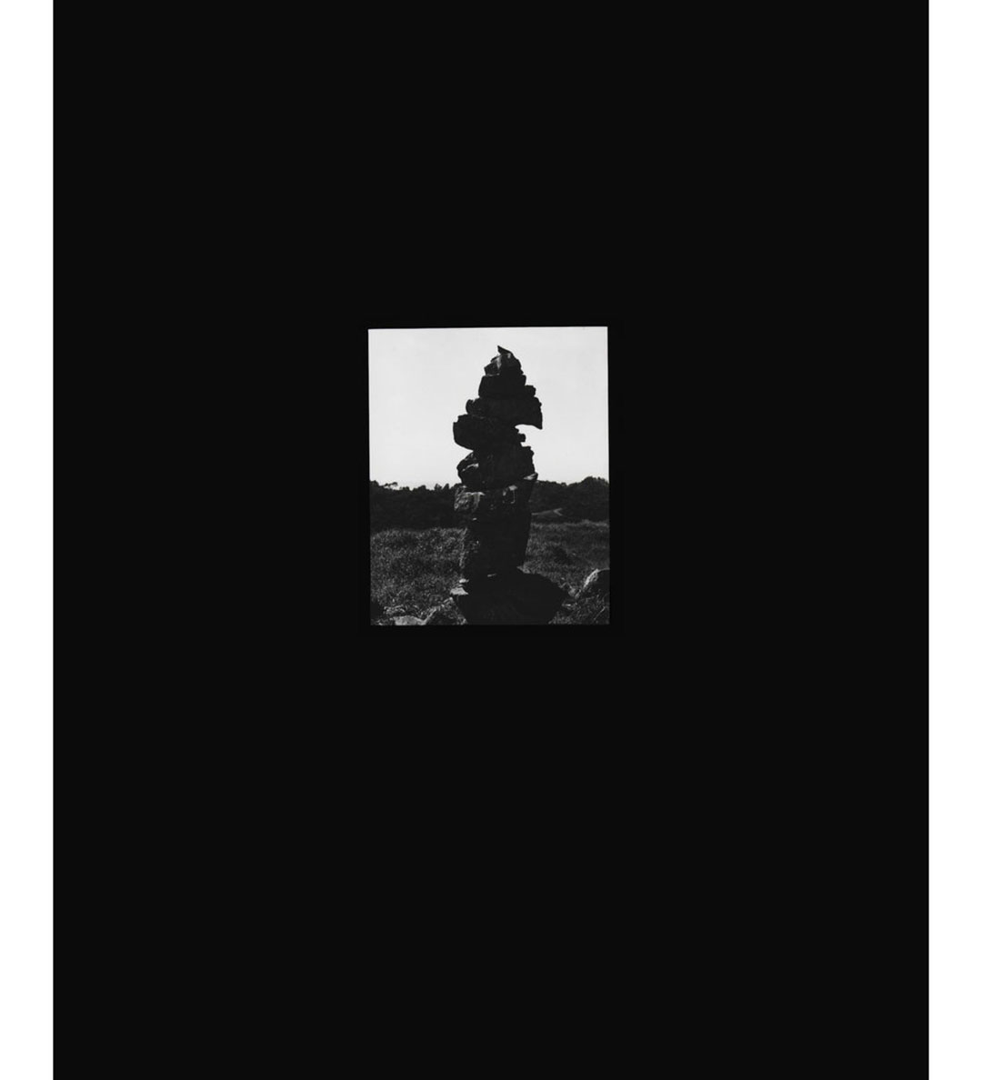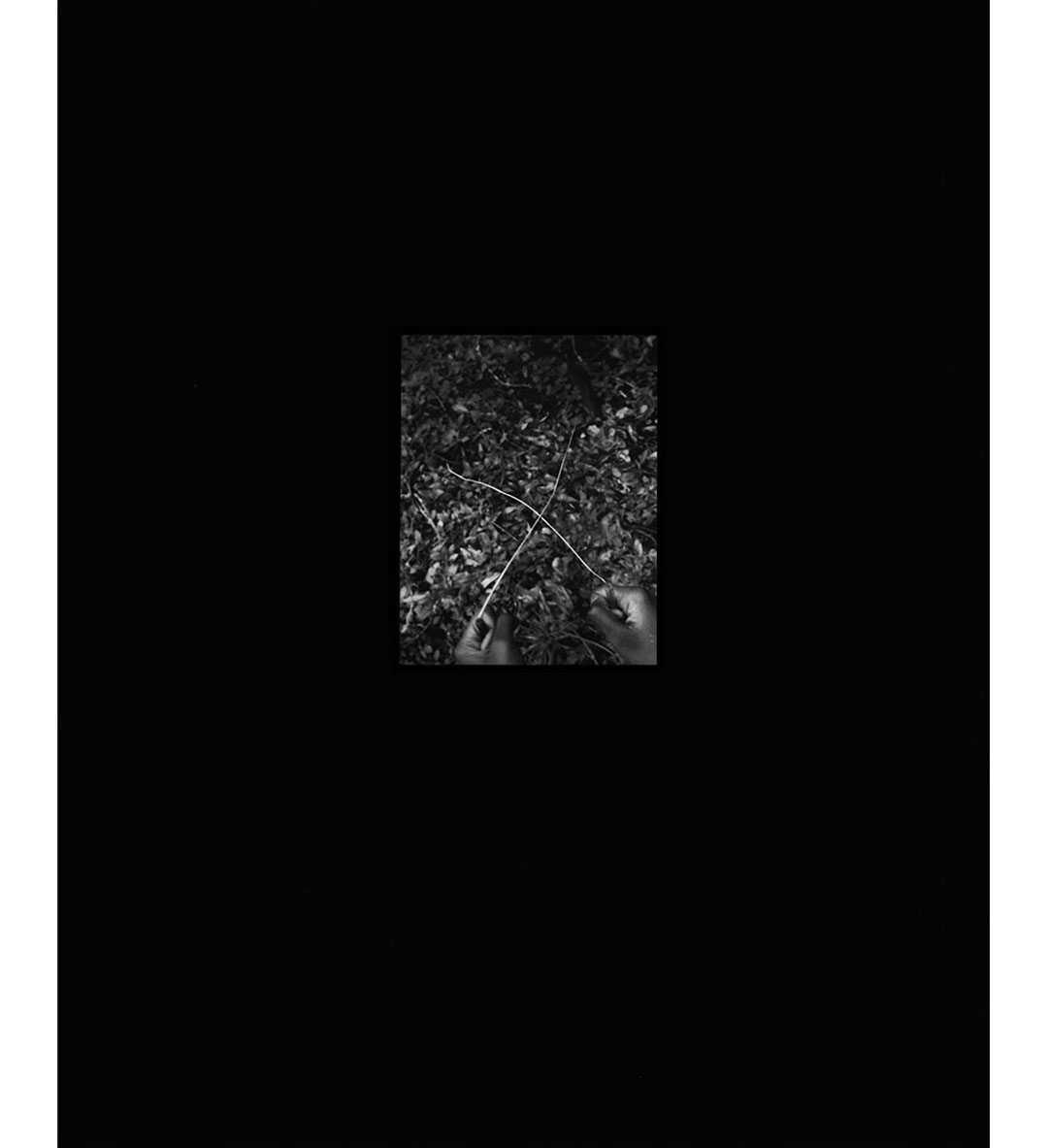 Cairns are human-laid piles of stones that act as markers and monuments within a landscape. They declare position, passage, and presence. Lee creates variants of the cairn in a triptych of black-and-white contact prints, reforming what is left behind in the American landscape by its many ancestors. Cairns (2018) begins with an image of a traditional trail marker: a precarious stack of thin, irregular stones. In the second photograph, the artist’s fists grasp thin twigs, held at an intersection: an X marking a spot. In the third, a tarp loosely hangs with white rope over soil, suggesting an anthropomorphized and spectral presence. The American landscape is laden with psychogeographic cairns that mark the violent histories of slavery, white supremacy, and racism. Yet it can be a space to reclaim, one in which to take the solace that it proffers. The cairn in Slow Build (2019), held by the shadow of Lee’s hand, has a wraithlike quality that is heightened by the dense greys of darkroom solarization. It is at once tender—the artist holds the land as kin—and haunting. These works visualize intangible yet palpable presences through the form of the cairn, a metaphoric guidepost that has more to tell than the immediately visible.