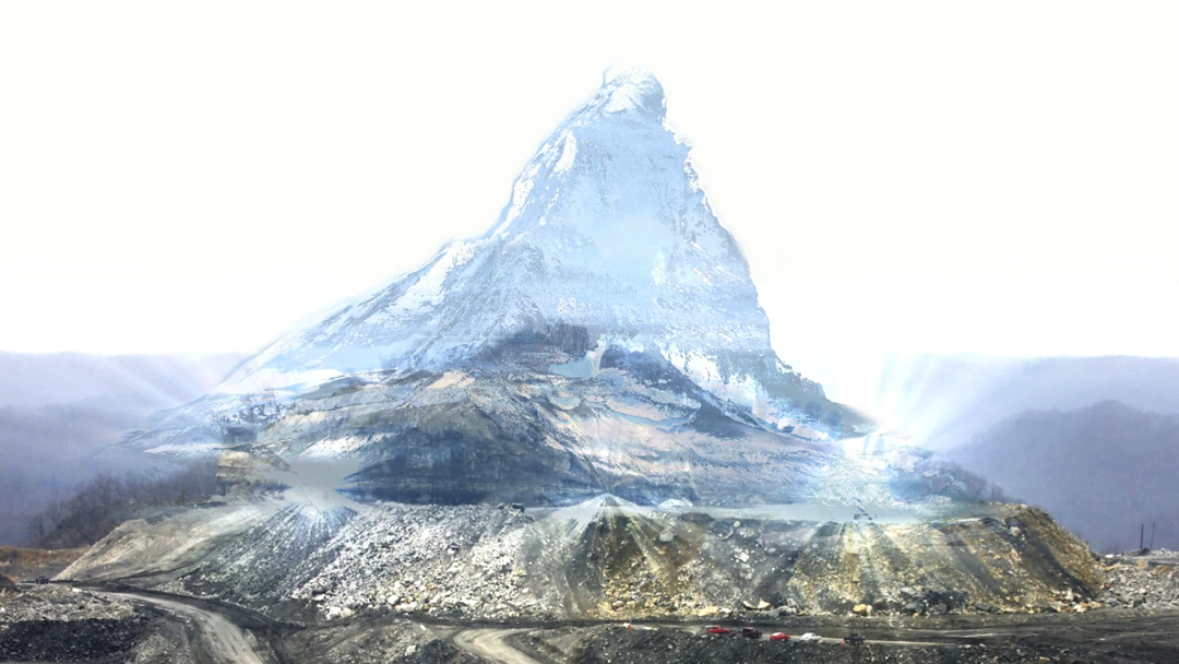 Becker further explores the tension between reality and myth in relationship to the Appalachian environment in the video Holographic Mountain (2017), showing a mountaintop removal (MTR) mining site in Helvetia. MTR is a method of coal mining that involves blasting the top of mountains to retrieve its minerals, thereby leveling the mountain. This decapitation process has an enormous impact on the health of nearby rivers, forests, and residents.2 It also has an enormous impact on how the mountains are seen and experienced. Here, the mountain is not a refuge or a place for leisurely subliminal exploration. The flattened peaks are surrounded by barren and dry deforestation and filled with the noises of construction. The federal requirements of MTR are such that after a company is finished mining, they are obligated to restore the area with something of “an equal or better economic or public use.”3 While it sounds promising, in practicality, companies have maneuvered around the requisite by planting a weak field of grass, delaying the completion date of a project, or in one case, proposing the construction of a prison.4