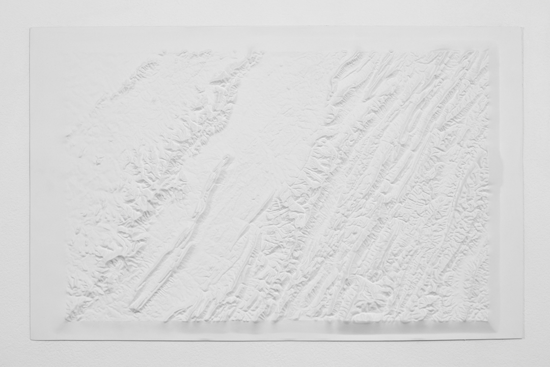 On Becker’s studio walls are pieces he is currently working on for a solo exhibition at Actual Size in Los Angeles. Three-dimensional topographical maps of popular mountain ranges, including Lake Tahoe and Aspen, are spray painted in white to match the white paint of the walls, removing all distinct characteristics of each region. Minimal and quiet, the series, titled Untitled Topographies (2016-present), withdraws from Appalachia’s specificity to engage in a broader imagination surrounding the idea of a mountain. On Becker’s desk sits a sketch of an unrealized public-engagement sculpture, which is most likely unfeasible. The piece commemorates the Hawks Nest Tunnel disaster of 1931, in which hundreds, if not thousands, of workers died from silicosis, a lung disease, during the mining and consequential inhaling of silica while constructing a tunnel in West Virginia. The exact number of deaths attributed to the mining incident is unclear, as many workers resigned and departed at different times due to illness. Becker’s sketch proposes a public glass-blowing happening, in which a large glass mountain is formed with as many breaths as lives lost.