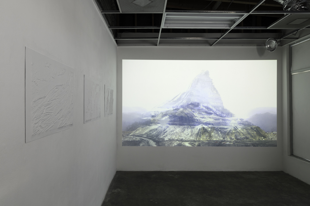 In Same Rock, Becker reflects upon the history and geography of Helvetia, a census-designated town in West Virginia that is known as “Little Switzerland.” Founded in the mid-1800s, the area was marketed specifically to Swiss immigrants through creative advertising that suggested the region’s similarity to the Swiss Alps. While the Swiss Alps are iconic for its majestic peaks that lure explorers and adventurers, the mountains of Helvetia have become heavily damaged through decades of mining and milling. This conflict between a landscape of leisure and a landscape of economy is represented in the multi-media piece Mountain is a Mountain (2015-present). Becker projects the two mountain ranges onto a horizontally severed rock—on top, the snowy angular peaks of the Swiss Alps, and on the bottom, an inverted image of the forested rolling ridges of Helvetia. The piece includes an audio narrative with various individuals describing what they think a mountain looks like. Becker solicits multiple voices in attempt to locate a universal understanding of a mountain. With descriptions such as “reassuringly brutal” and “white snow drifts across the top,” Mountain is a Mountain reveals how the Swiss Alps specifically have formed the archetypal mountain in the Western cultural imagination.