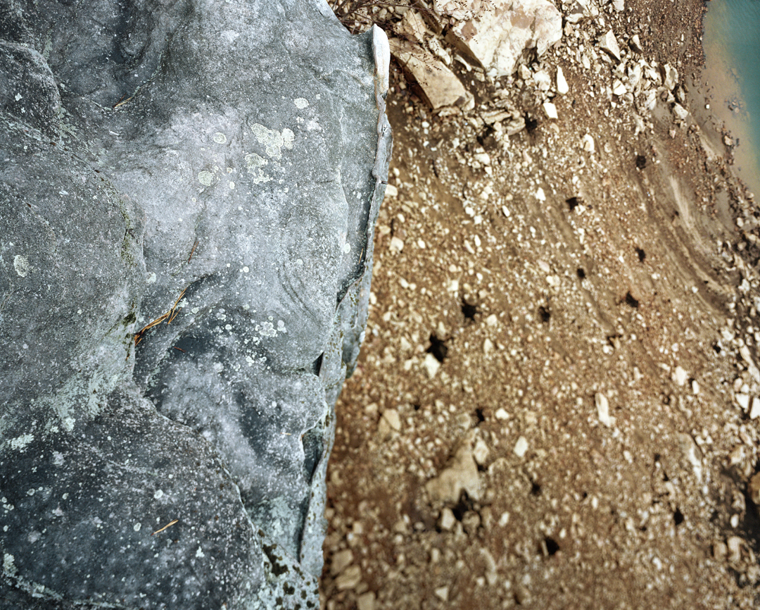 Becker describes his introduction to photography through thinking of the medium as a tall tale. Historically, photography has been understood as a representation of truth, but as Becker suggests, it requires a set up to convey a story. The photographic series Thank G-d for Mississippi (2009) uses the medium’s narrative malleability and is one of Becker’s earliest works focusing on the Appalachian region. As a state, West Virginia faces harsh socioeconomic conditions, falling at the very bottom in areas concerning poverty, healthcare, and education—often ranked 49th in the United States.8 The title Thank G-d for Mississippi, Becker tells me, alludes to the fact that Mississippi is ranked at 50th. It’s an adage that reflects the sentiment that things could be worse, reflecting the dark humor expressed in West Virginia and how hardships are coped through language. The series consists of eight large photographs—each at approximately four by five feet—depicting oceans, cliffs, rocky waterbeds, and other sites in the state of West Virginia where people are known to jump—often, to meet their fate. Becker captures these locations by hanging a camera from a boom to retrieve the perspective one would get after having jumped. Their scale enhances the photographs’ askew composition and creates a bodily sense of vertigo. Thank G-d for Mississippi is one of Becker’s early attempts to complicate landscape, revealing that environments are never neutral and hold individual consequences.