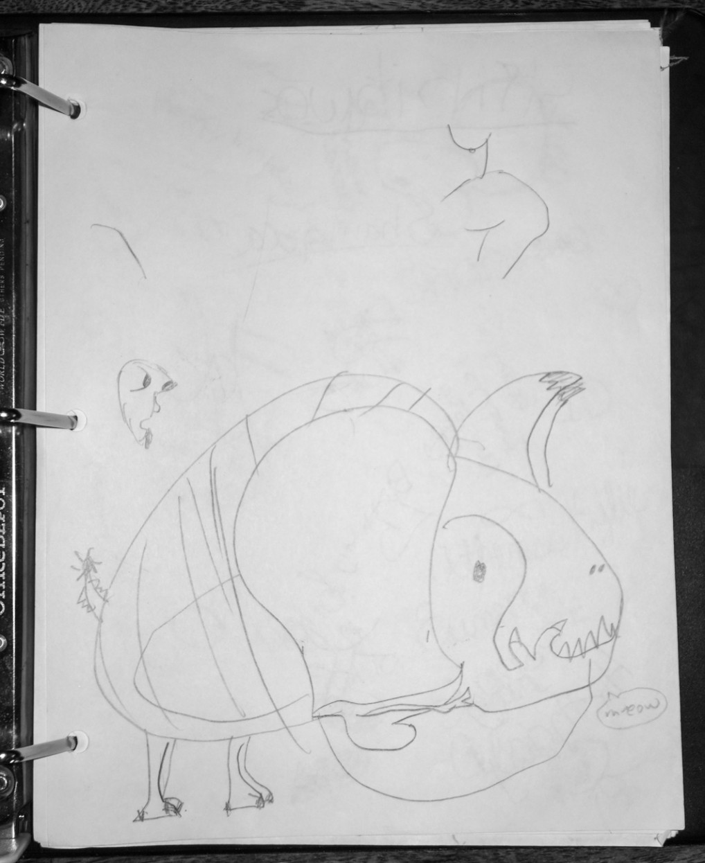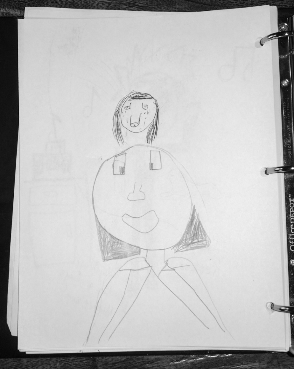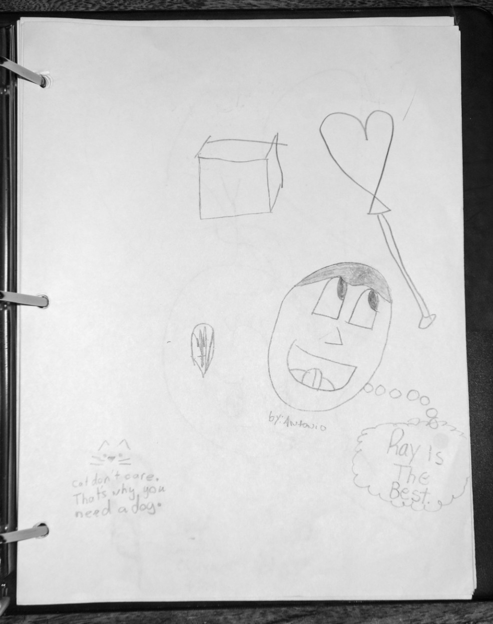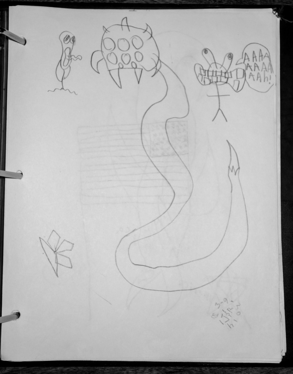 The two books of drawings and notes by visitors in the Residence reflect this reaction to melodrama. The Residence as a whole, including the almost naïve heart-on-its-sleeve feeling of the works within, is echoed in the incredible drawings left by visitors: raw, quick sketches and signatures that are honest, silly, and oddly poetic. Think of a student in a museum, charged with drawing pictures of the various masterful sculptures and paintings on display; here, instead of depicting the various creatures in the works, the visitors invent some of their own. Nelson was particularly attracted to these drawings, and her photographs reflect this spirit of invention.